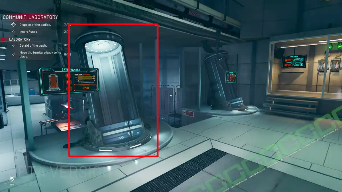 Take the elevator up to the second floor to reach the Laboratory. Here, you first enter a corridor with six cryo tanks. There is a lab section to the left and to the right. Those two are connected by a corridor that has an elevator to the Lounge.