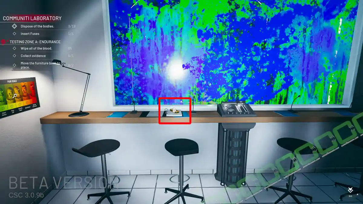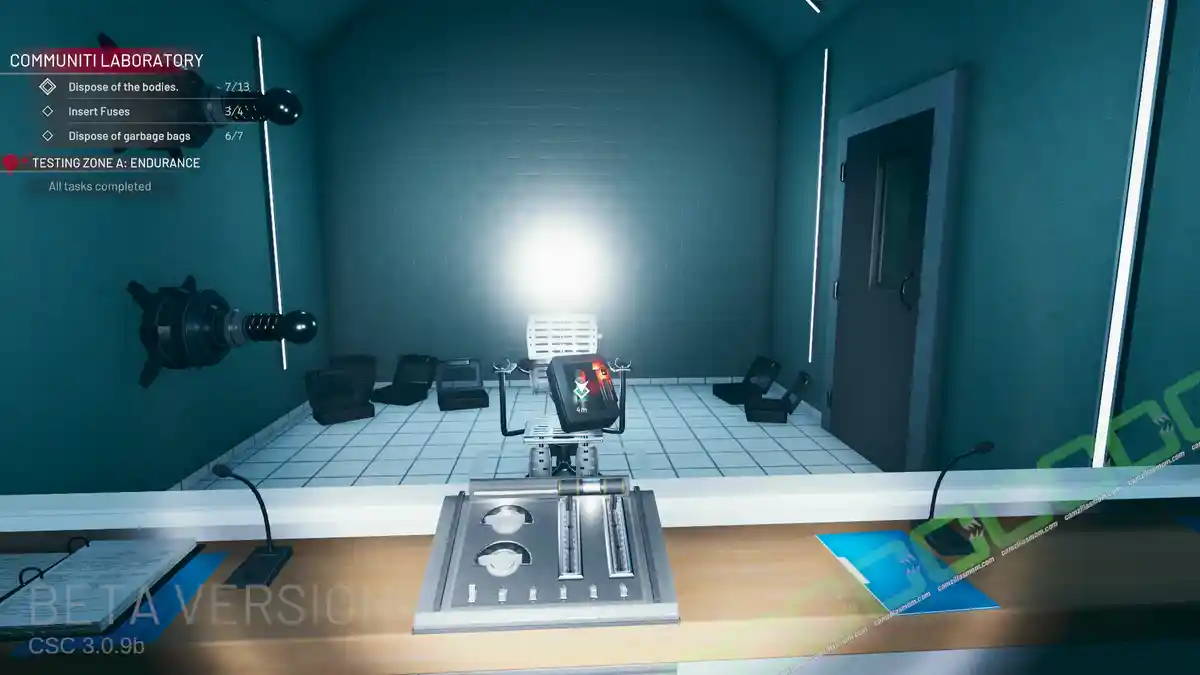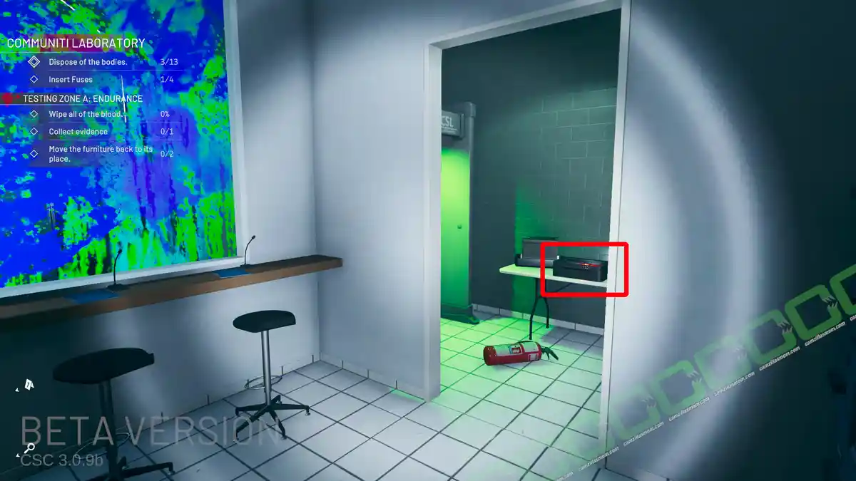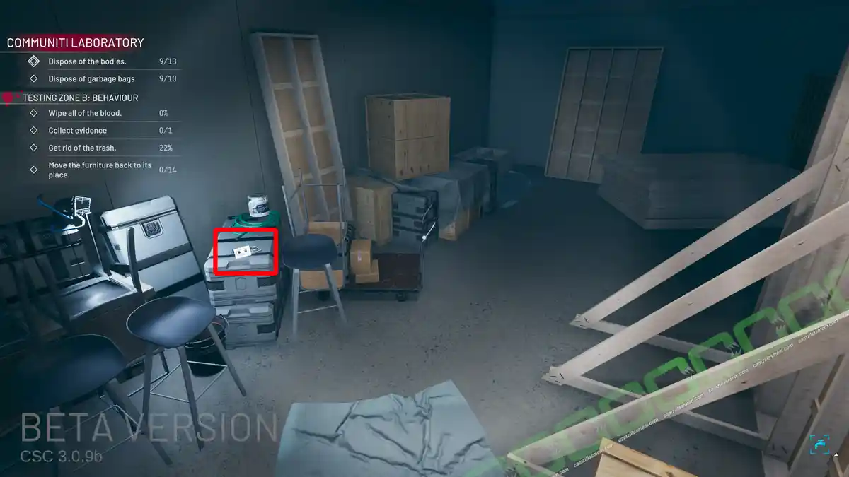 The Testing Zone B can be accessed through the Control Room. It is a large room with an expansive labyrinth built out of wooden walls. It looks like a Crime Scene Cleaner training center.