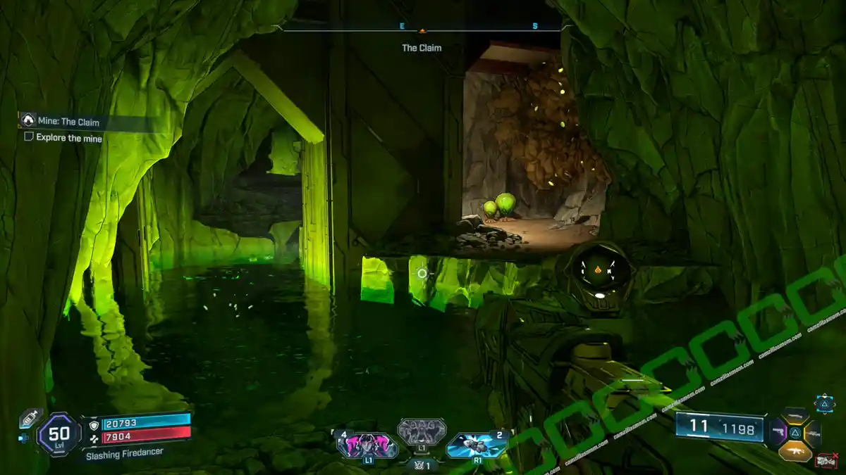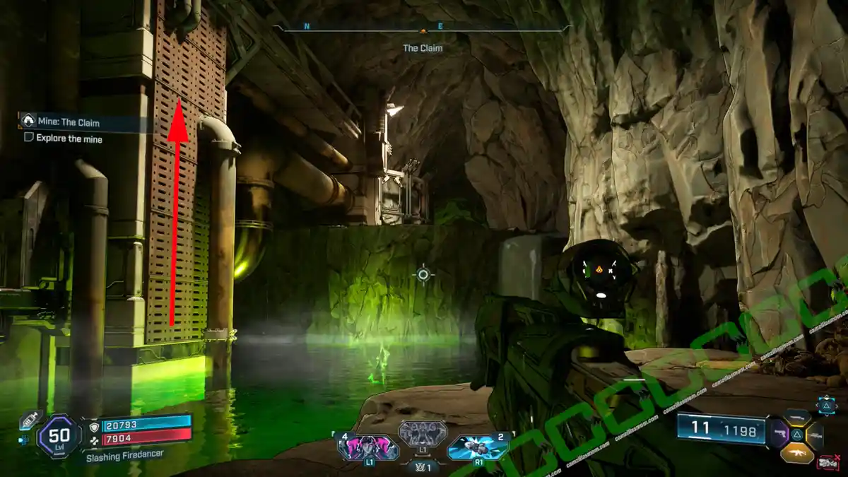 At the other end, reach the top by jumping on the ledges. Then, use the metal wall to climb across the toxic goo-filled corridor. Cross the next room by using an overhead grapple point to reach the vending machines to fight The Backhive.