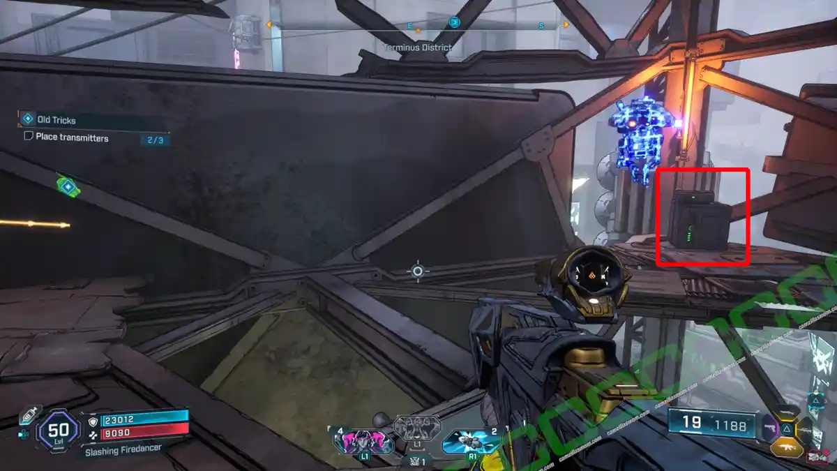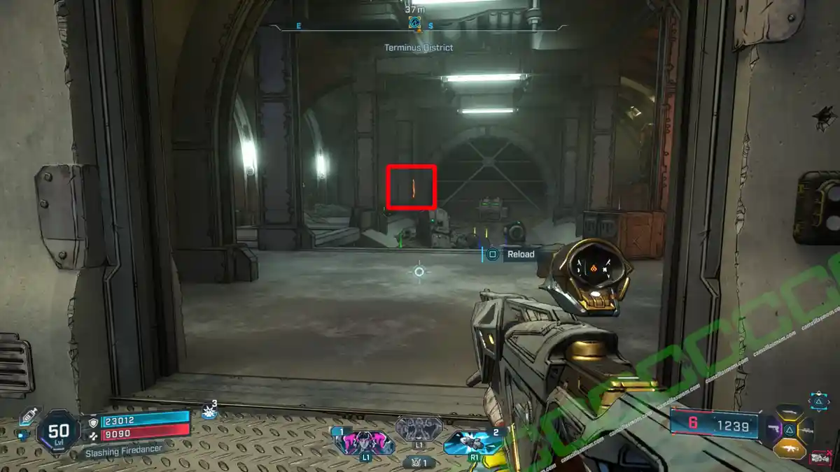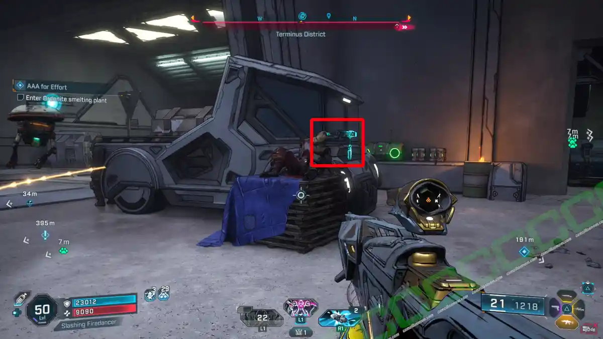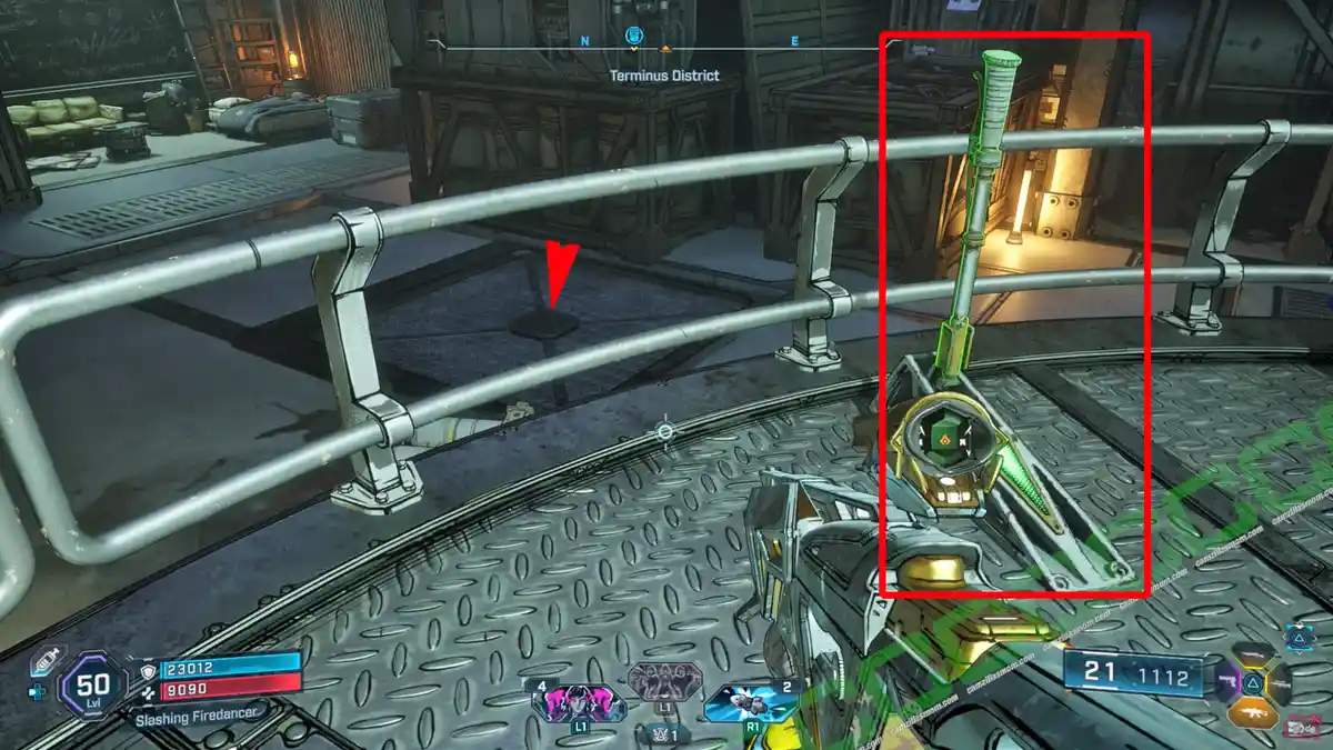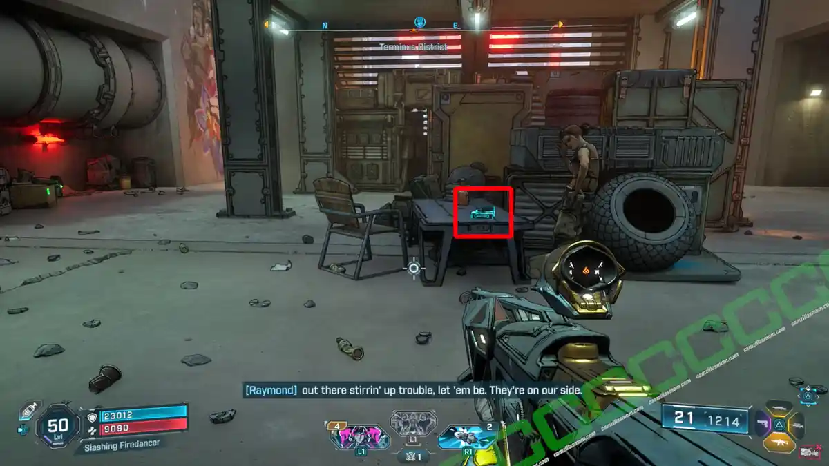 In the center of the Terminus District map, between Ascension Plaza and Tempered Manufactorium, is a man who is wearing the Vault Hunter’s Guide to Kairos: Vault Hunting on his head.