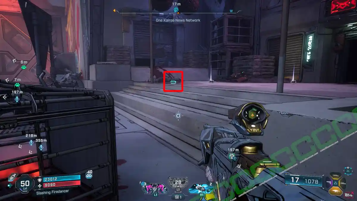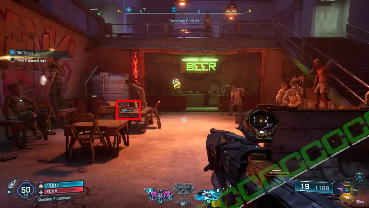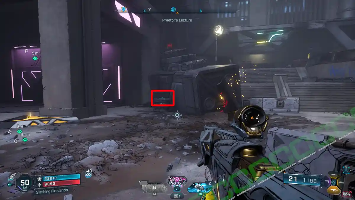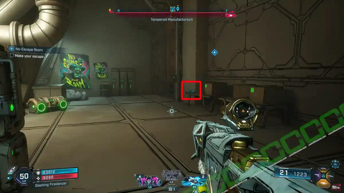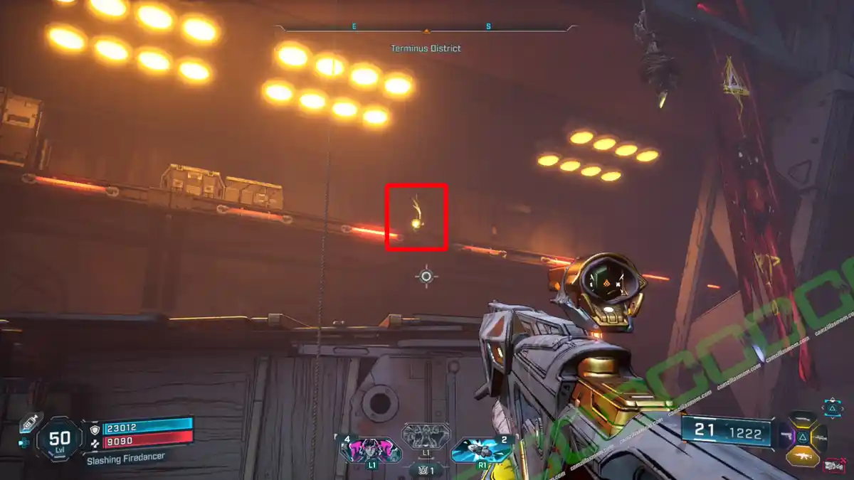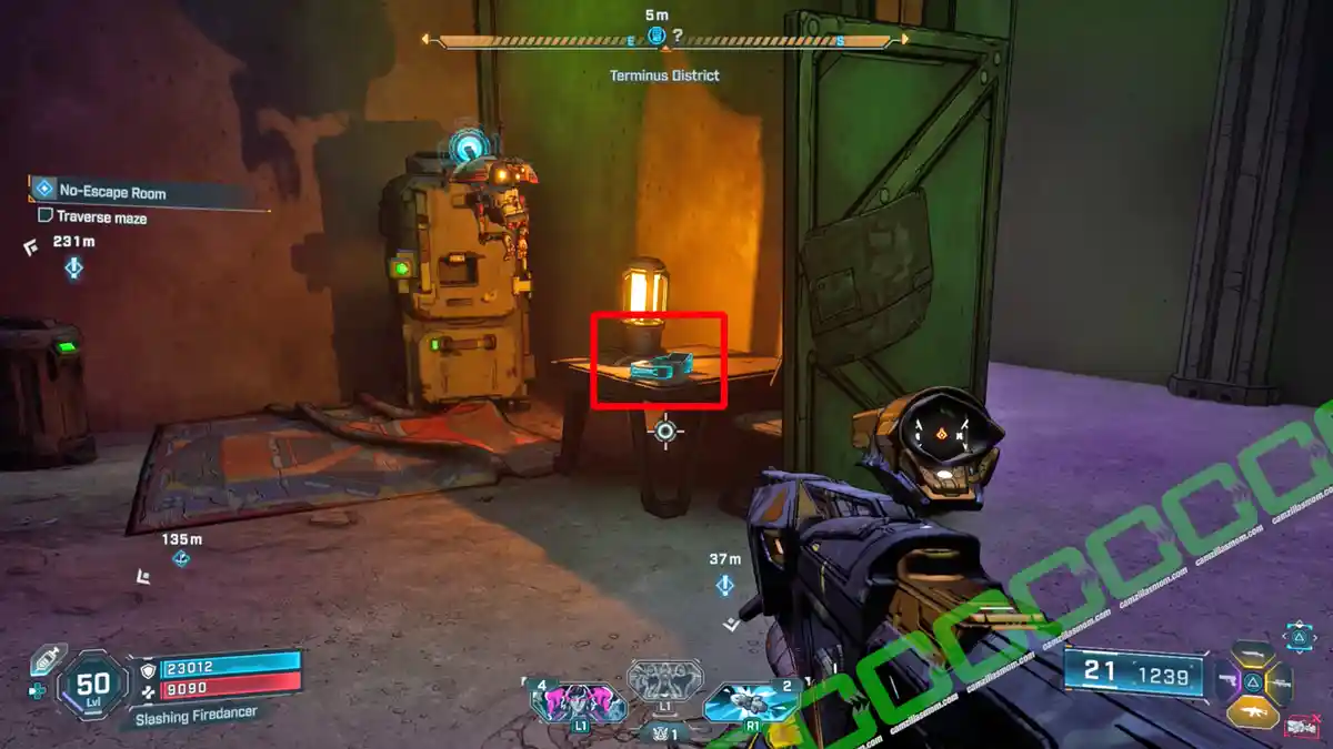 In the center of the Terminus District map, between Ascension Plaza and Tempered Manufactorium, is a man who is wearing the Vault Hunter’s Guide to Kairos: Vault Hunting on his head.
