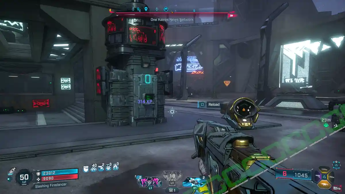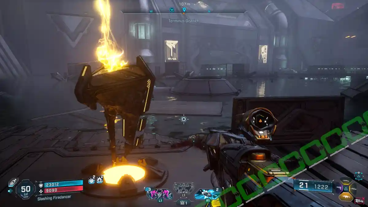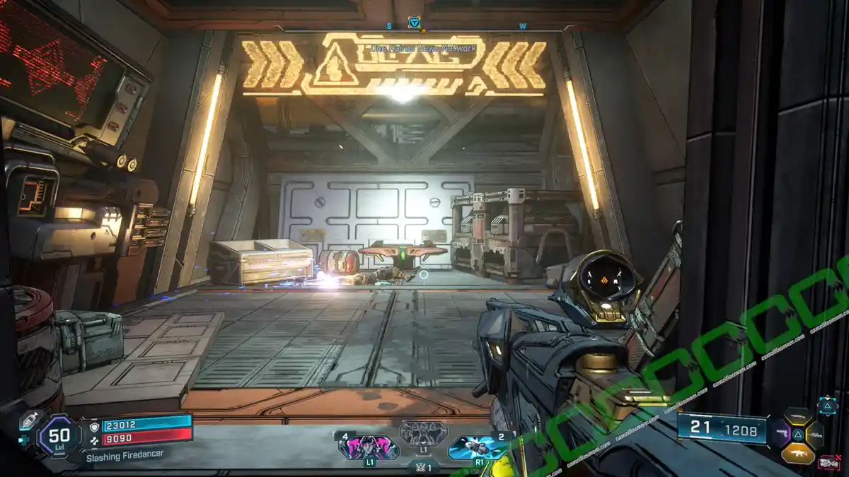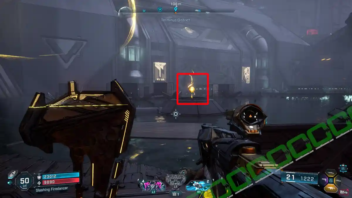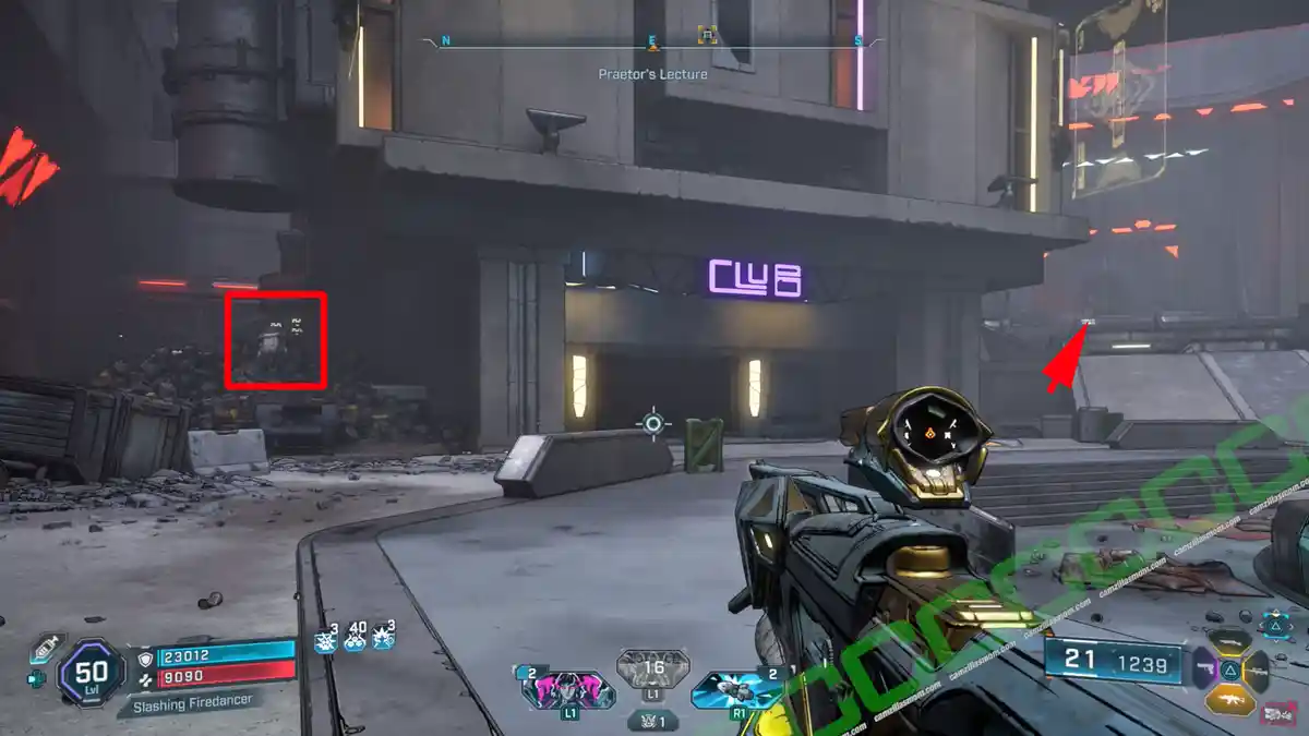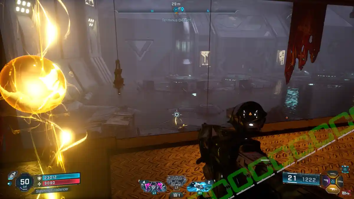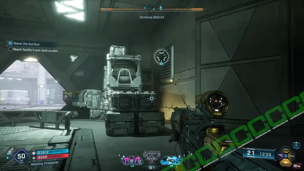 Enter the bunker and follow the path to a forcefield. Shoot the highlighted cubic core in front of it to pass. This will continue like that. The cubic cores are highlighted in the HUD. You need to destroy the left and the right power cores to continue on to the main room with the vending machines. Fight Directive-0.