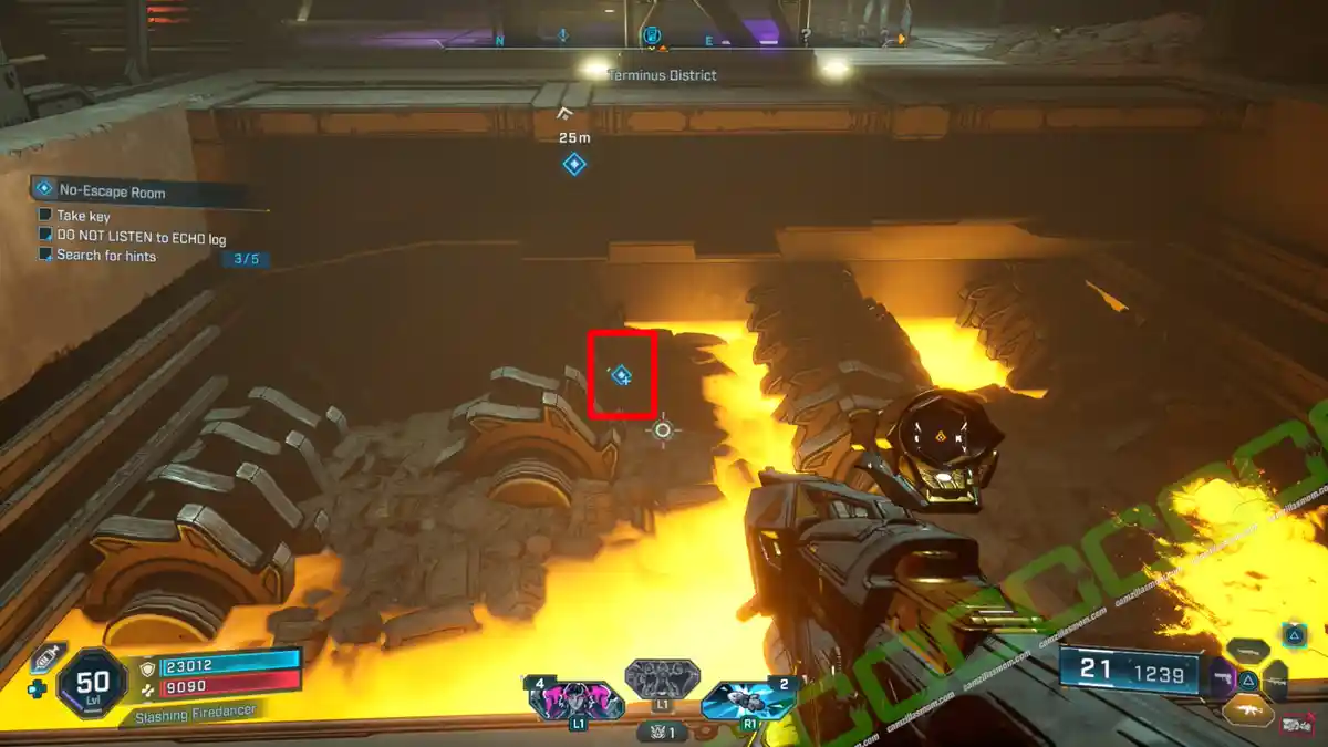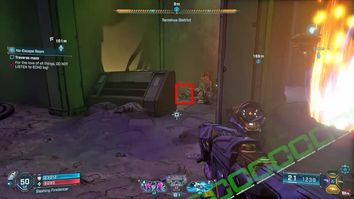 In the first room of the No-Escape Room Side Mission, there is an ECHO Log at the back of the garbage pile.