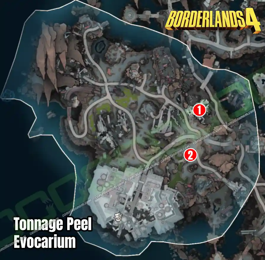 The second Eridian Evocarium is just by the southern toxic pool on the Tonnage Peel map. Give it a tap, and it’ll pop out those three glowing orbs.