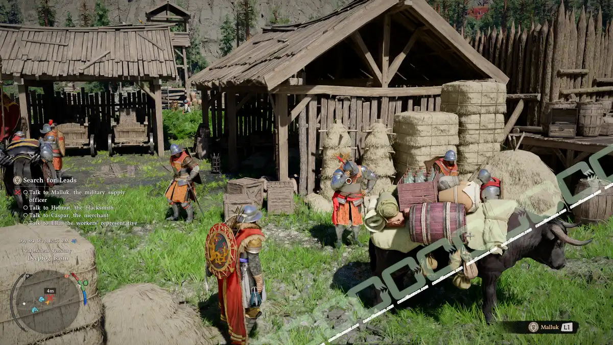 Malluk is the military supply officer and is stationed in the east at an unnamed camp near the river. He reports that Helmut, the blacksmith, confirmed there was no problem, and Malluk suspects Caspar, the merchant.
