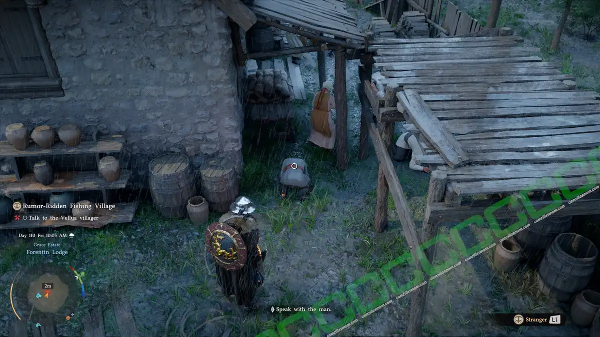 The Vellua Villager you have to talk to next is at Forentin Lodge, north of Vellua. There are many beggars and soldiers here, as if they had fled to safety. The person to talk to is behind the house.