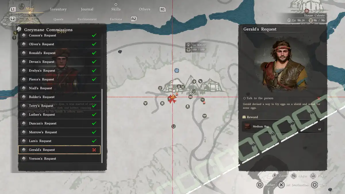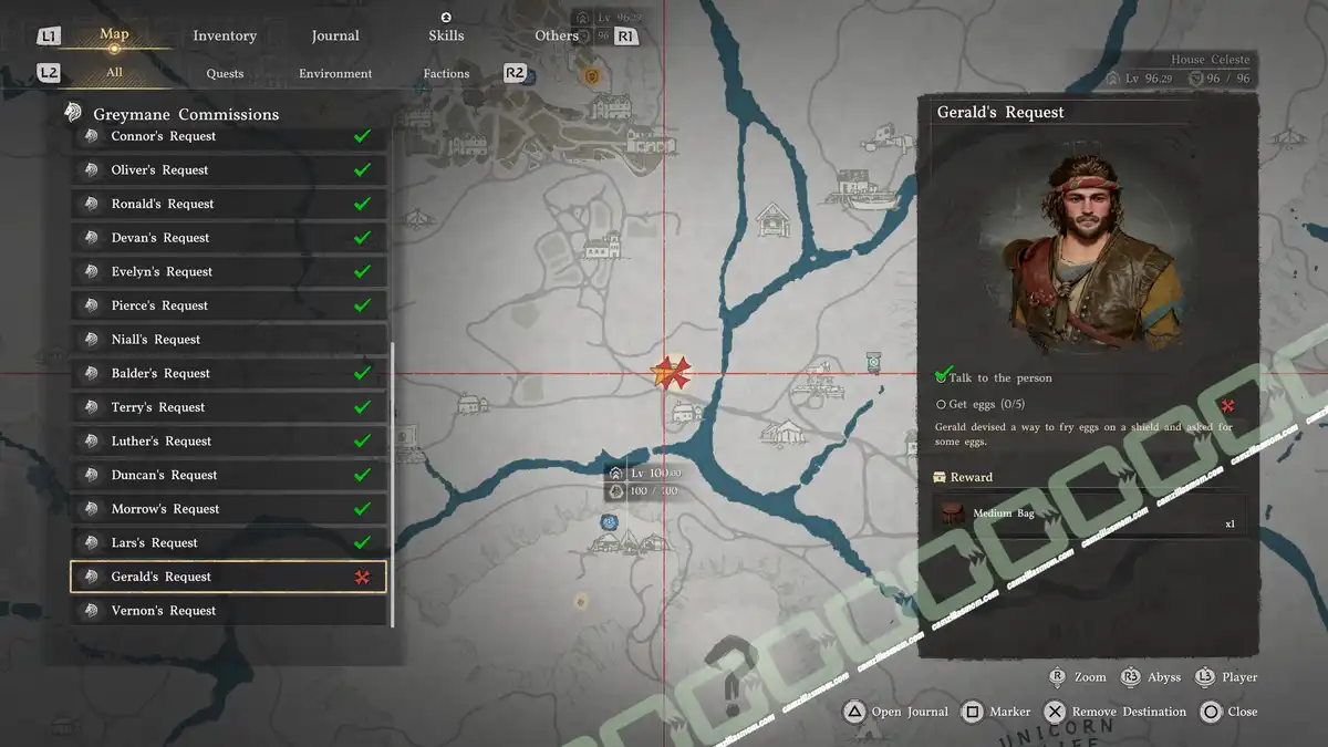 Gerald needs five eggs. The easiest way to get eggs is to raise chickens at the Ranch. This will generate chicken egg output that will end up in the Private Storage chest in the main tent. If you have that, you can save yourself a trip to the quest marker.