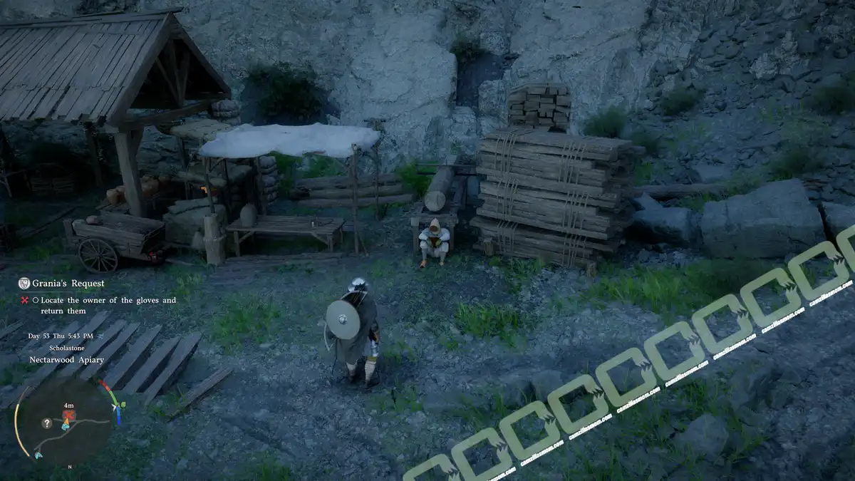Grania is the Innkeeper of Kharonso in Scholastone, the town you had to pass through in Chapter 3 to reach the institute. Her counter is outside. Talk to her and ask about the request. She wants you to return the Beekeeping Gloves to the owner.