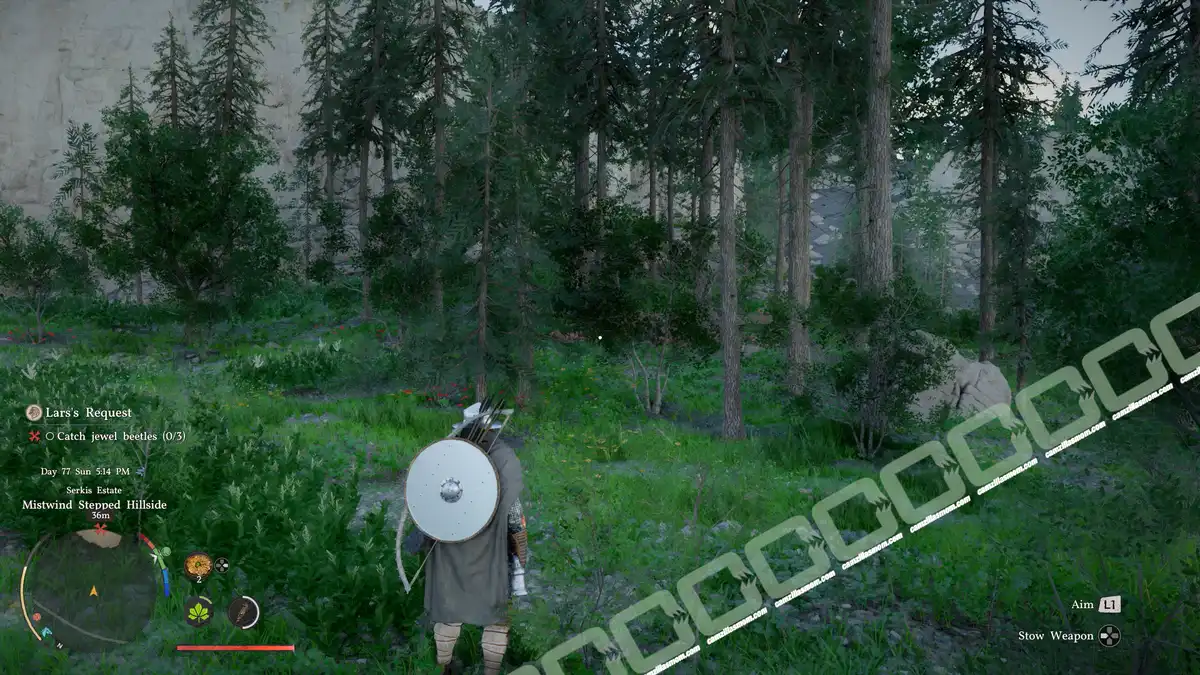 The quest marker is sending you to the west, to a point where the river bends to the south. There is a small forest with a pine mushroom patch in the center. The Jewel Beetles are sitting on the pine mushrooms and in the trees around them.