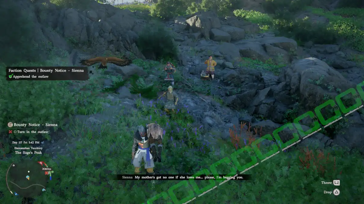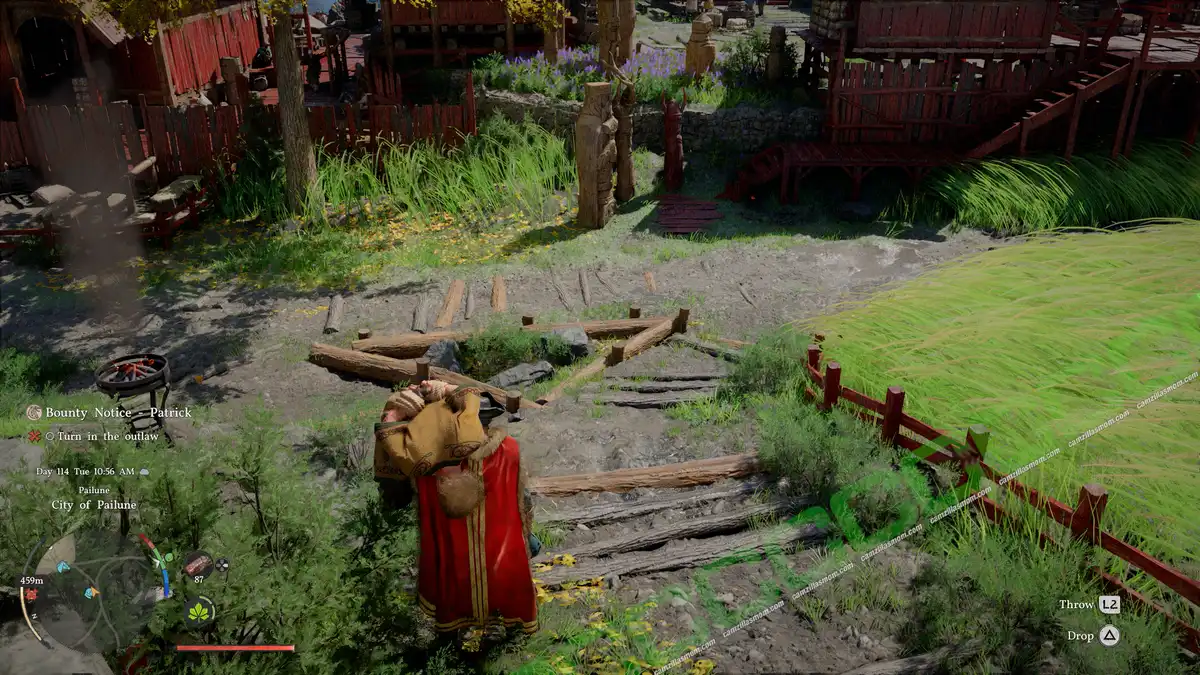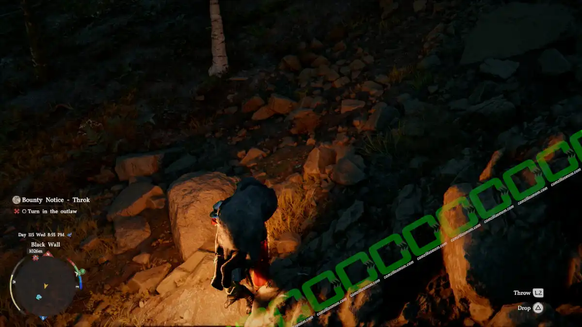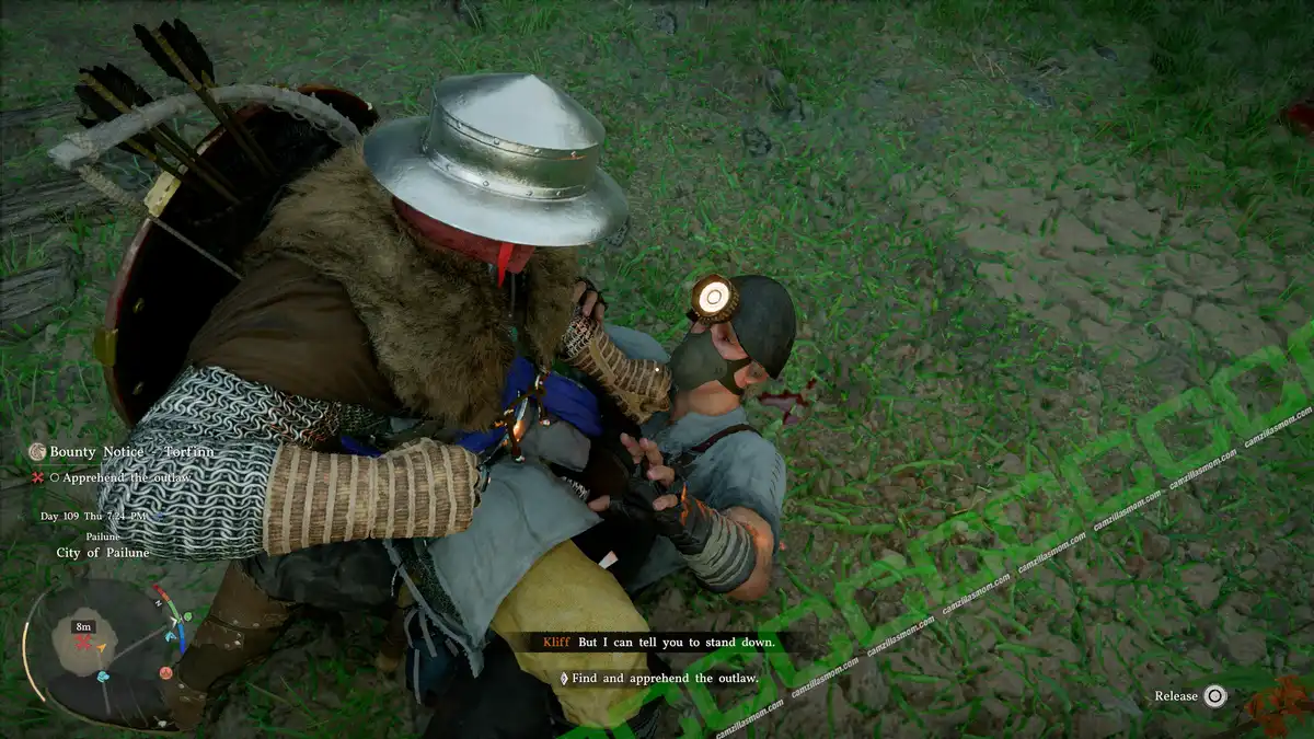 Throk is at a camp in the forest in the southeast of Pailune City. The difficulty here is that he is surrounded by a swarm of hostile dogs, and he will run off. Just run after him without tackling or fighting the dogs until the dogs stop following. You can then tackle Throk and tie him up.