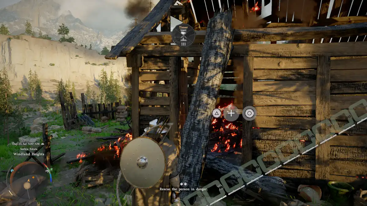 A log is blocking the house’s entrance. Use “Nature’s Grasp”, an ability in the green area of the skill tree, to remove the log. Throw it aside and enter the house. Marten, the person who needs rescuing, is in the corner of the house. Just walk through the fire, pick him up, and carry him outside.