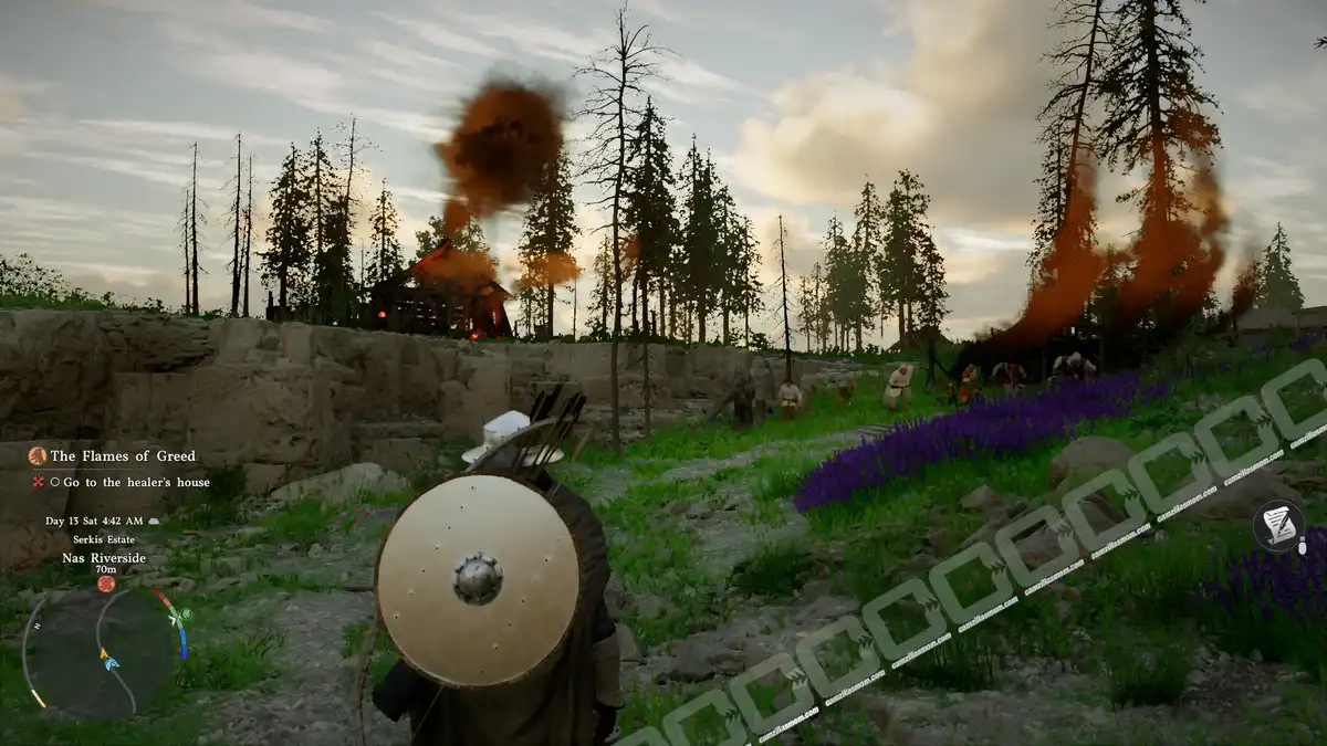 You will know that you are at the right place when people are fleeing towards you, with the houses burning in the background. Talk to the people in front of the healer’s house.