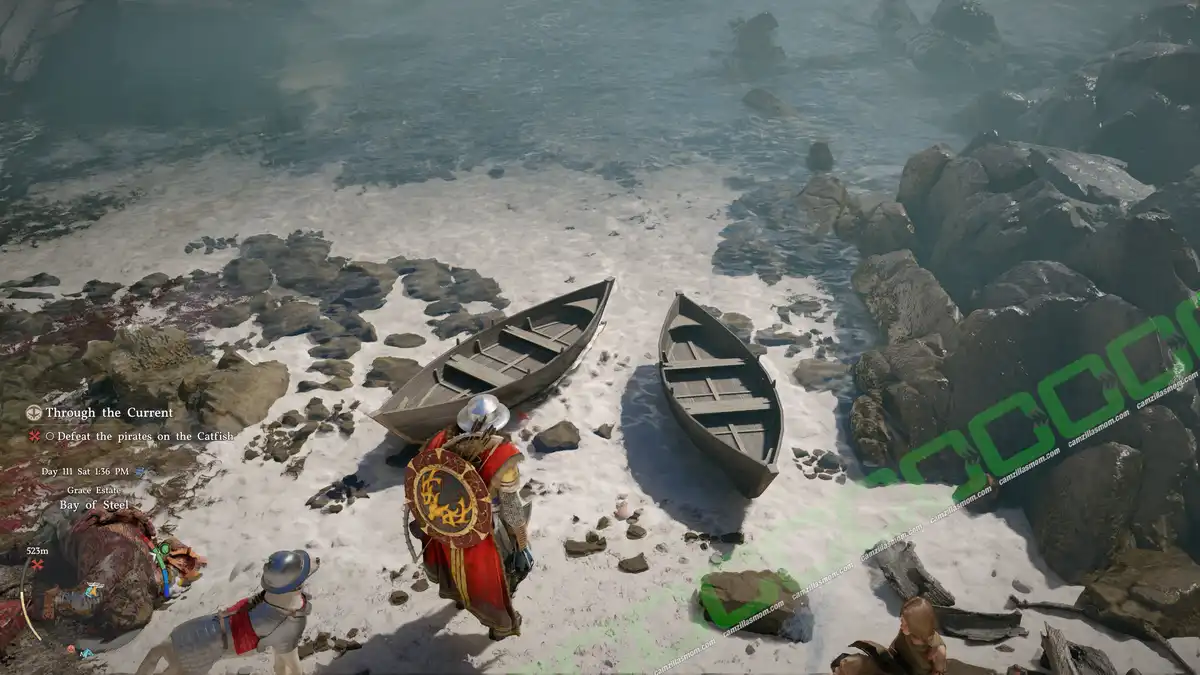 Rosa asks you to take care of the pirates once and for all. Operate one of the nearby rowboats and row to the Catfish, the big ship.