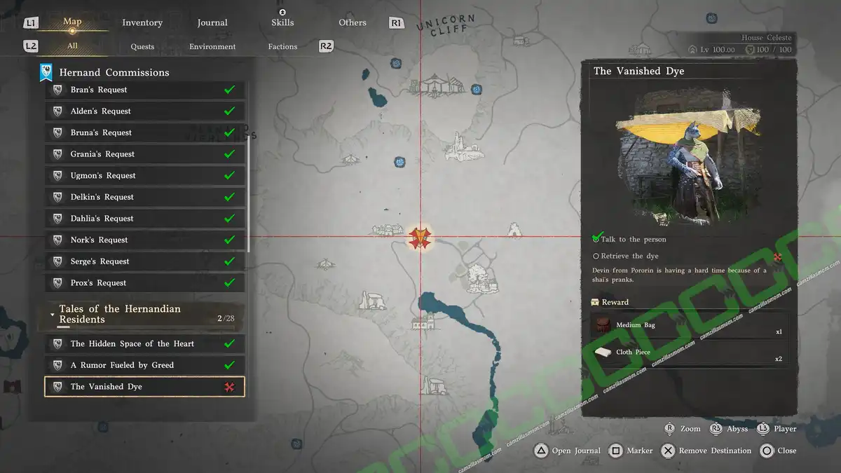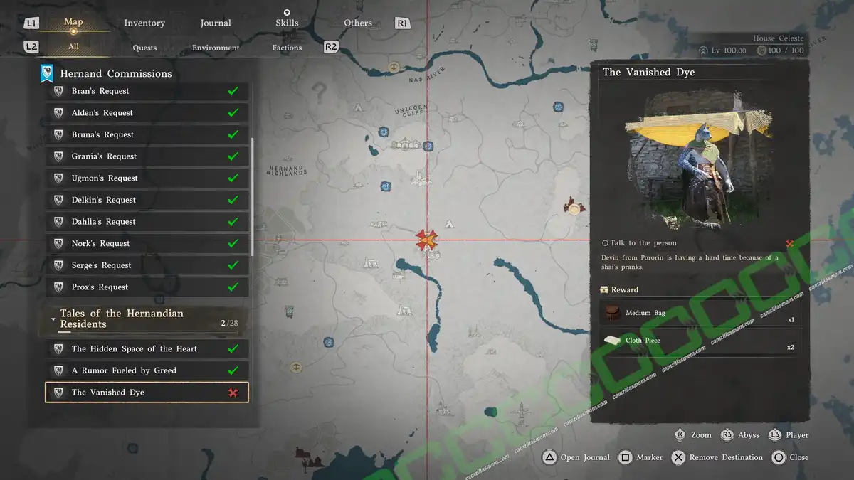 The Vanished Dye is a Hernand Commission: Tales of the Hernandian Residents. This resident is in the Pororin Village. So, The Unreachable Village and Authorized Access are needed to talk to Devin from Pororin. If he only wants to sell you his wares and does not ask for help, continue with the Main Quest and come back later.