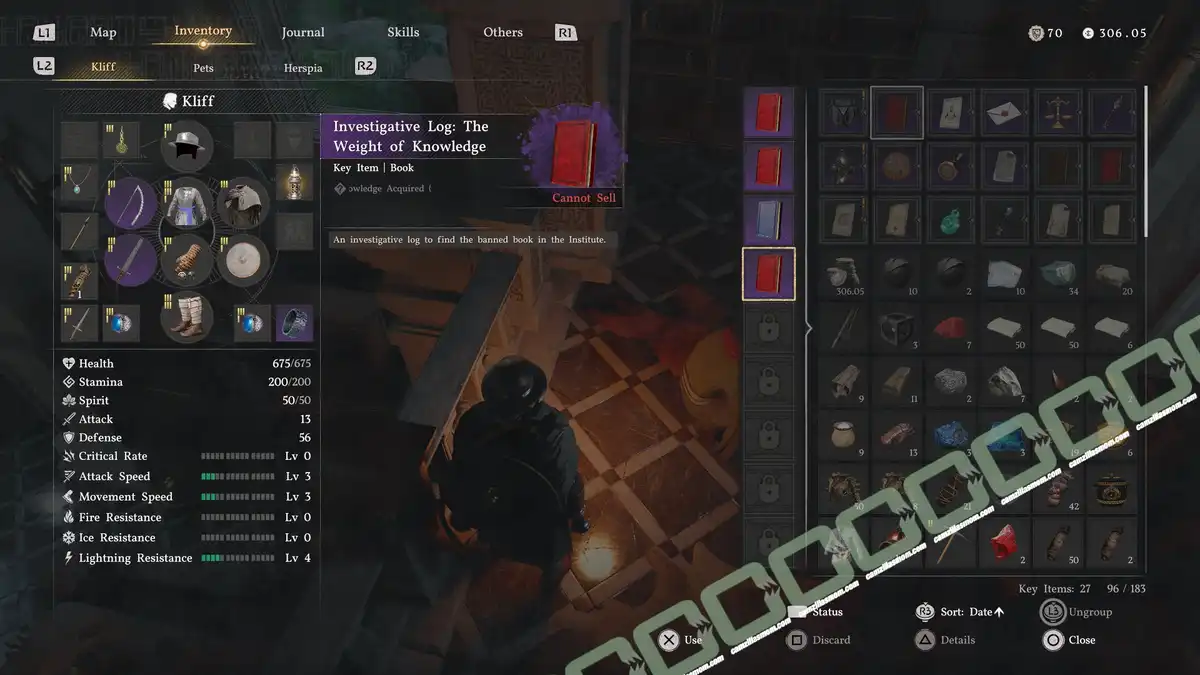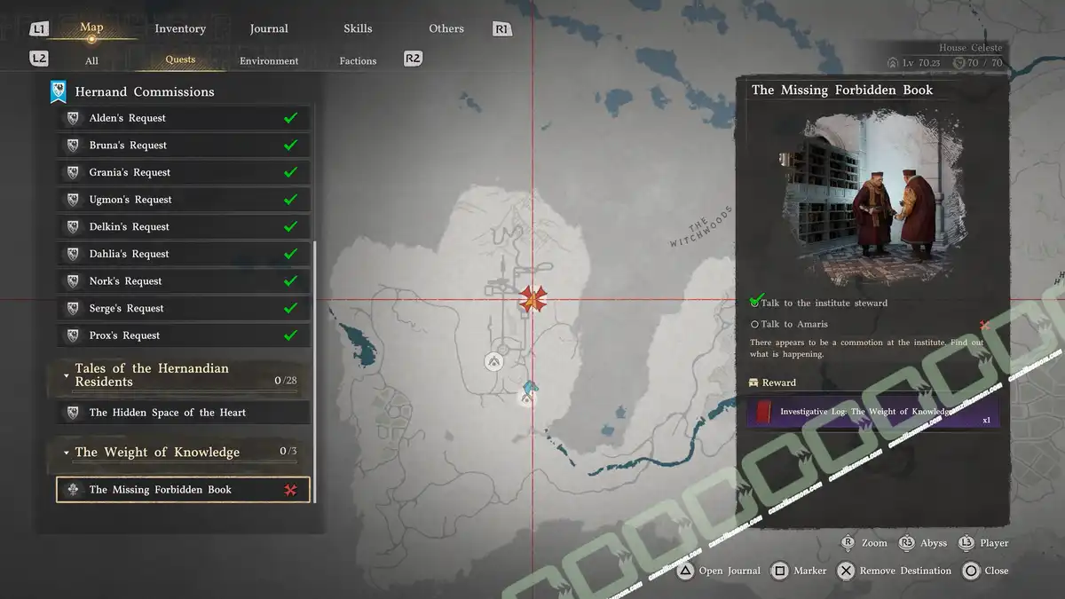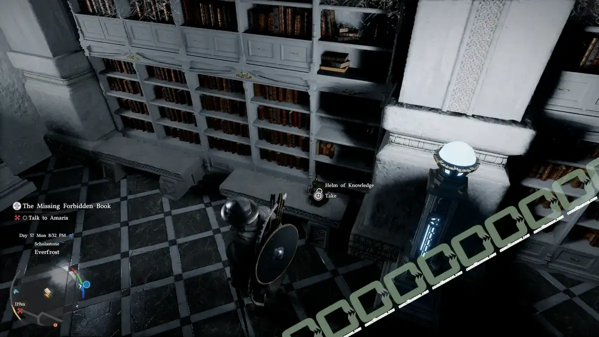 The actual Helm of Knowledge from the purple book is upstairs from the library, on one of the benches. Wear it to gain knowledge from afar. This will help collect Institute Knowledge for the research at Grunvar’s.