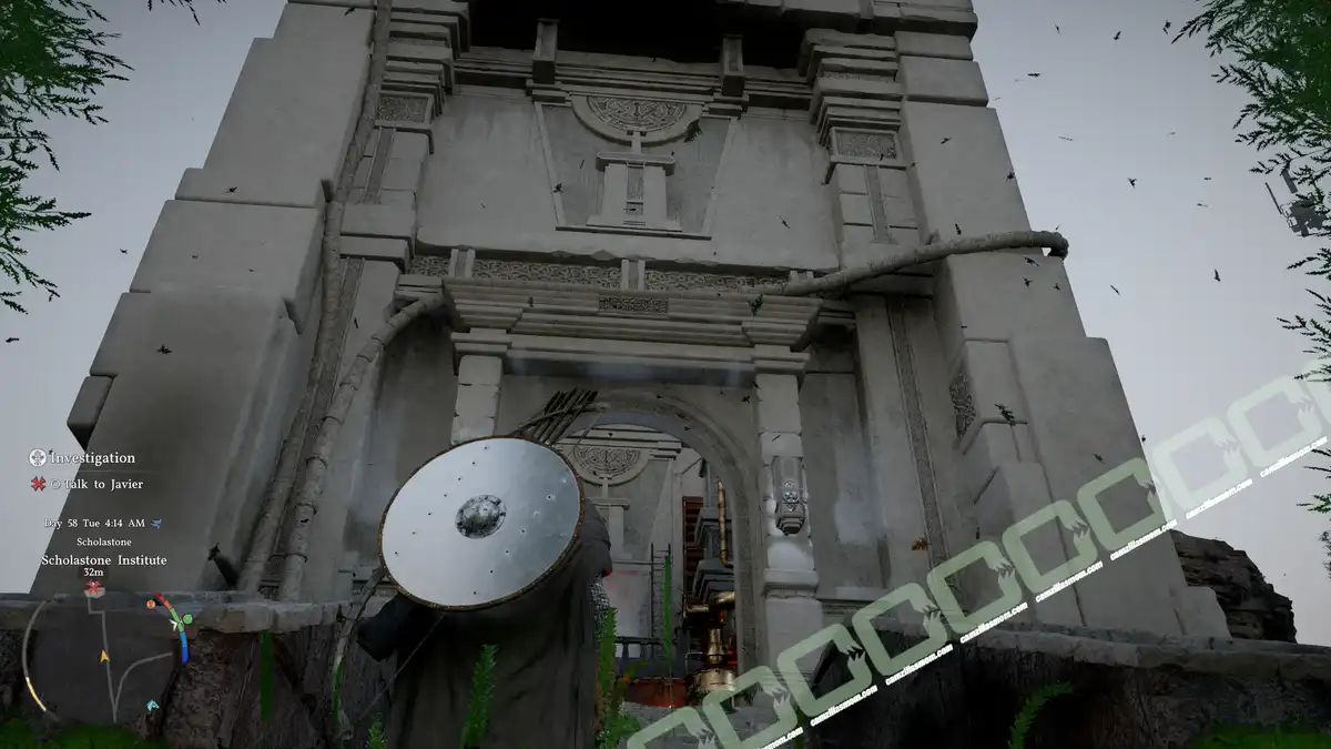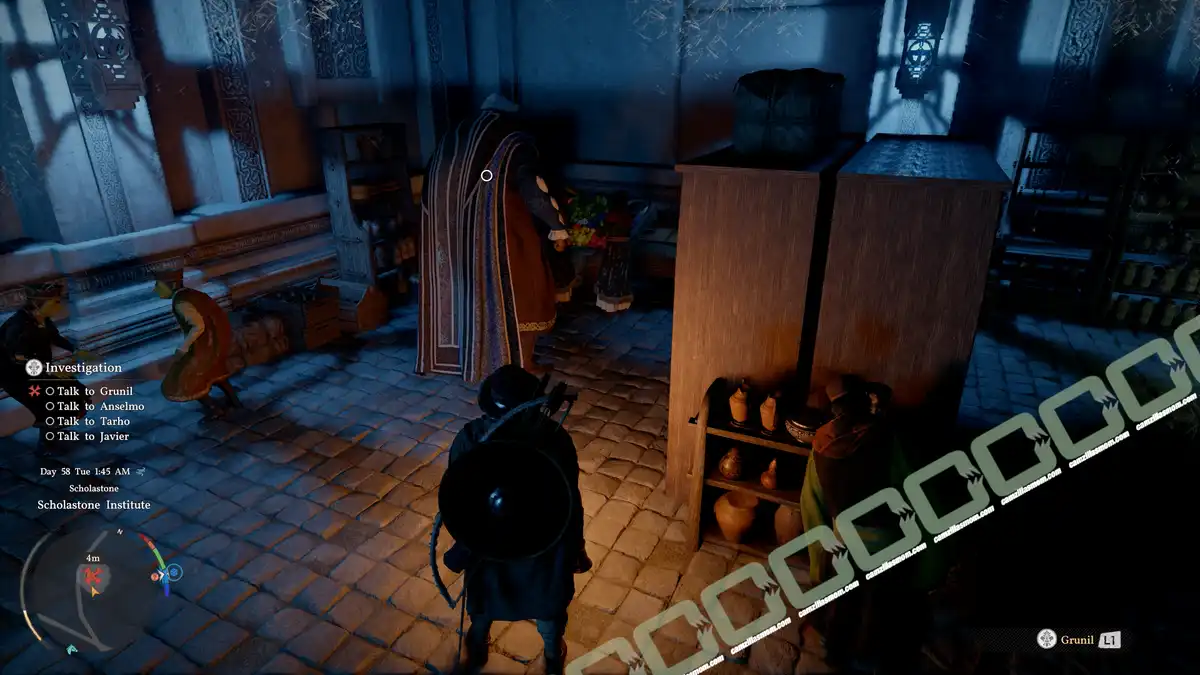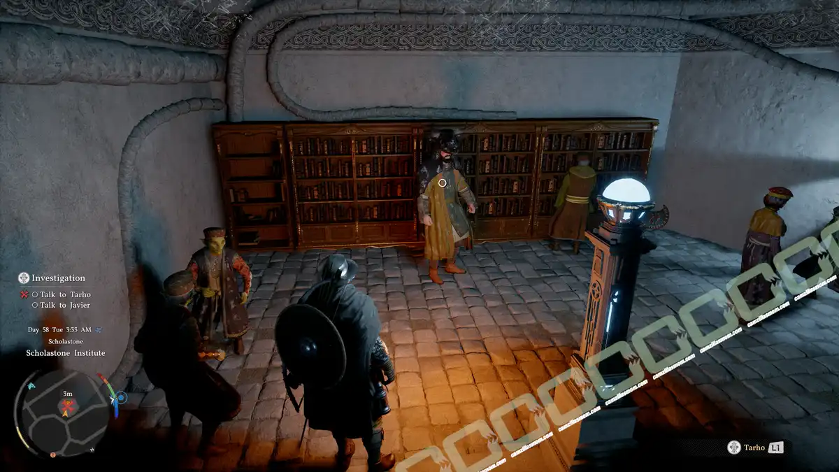 Anselmo is standing in the round entrance hall of the institute. He tells you that on that day, Grunil, Tarho, and Javier came to the Great Library.