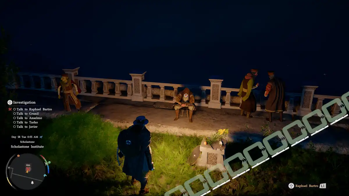Raphael Bartro is sitting upstairs in the Institute’s garden. He claimed that he wasn’t in the library that day and suspects Grunil.