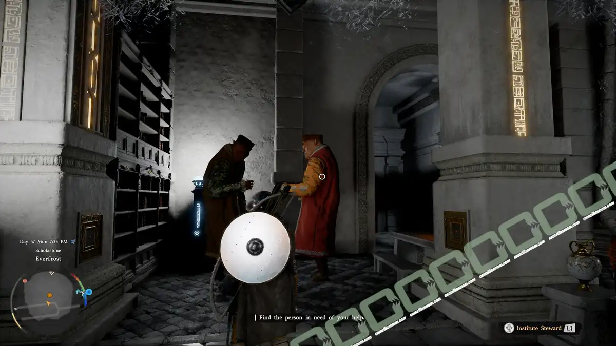 There is an agitated Institute Steward discussing with a colleague in the library at the back of the Institute. Talk to him.