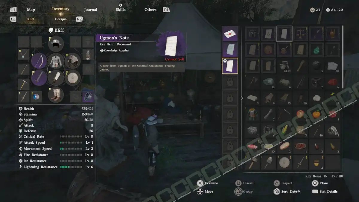 Ugmon’s note is in your inventory. It’s a purple “key item”. Examine the note.