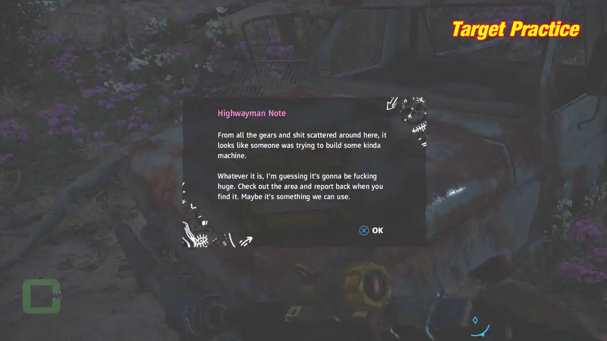 The Treasure Hunt note is in the middle of the junkyard. Pick it up to start the mission.