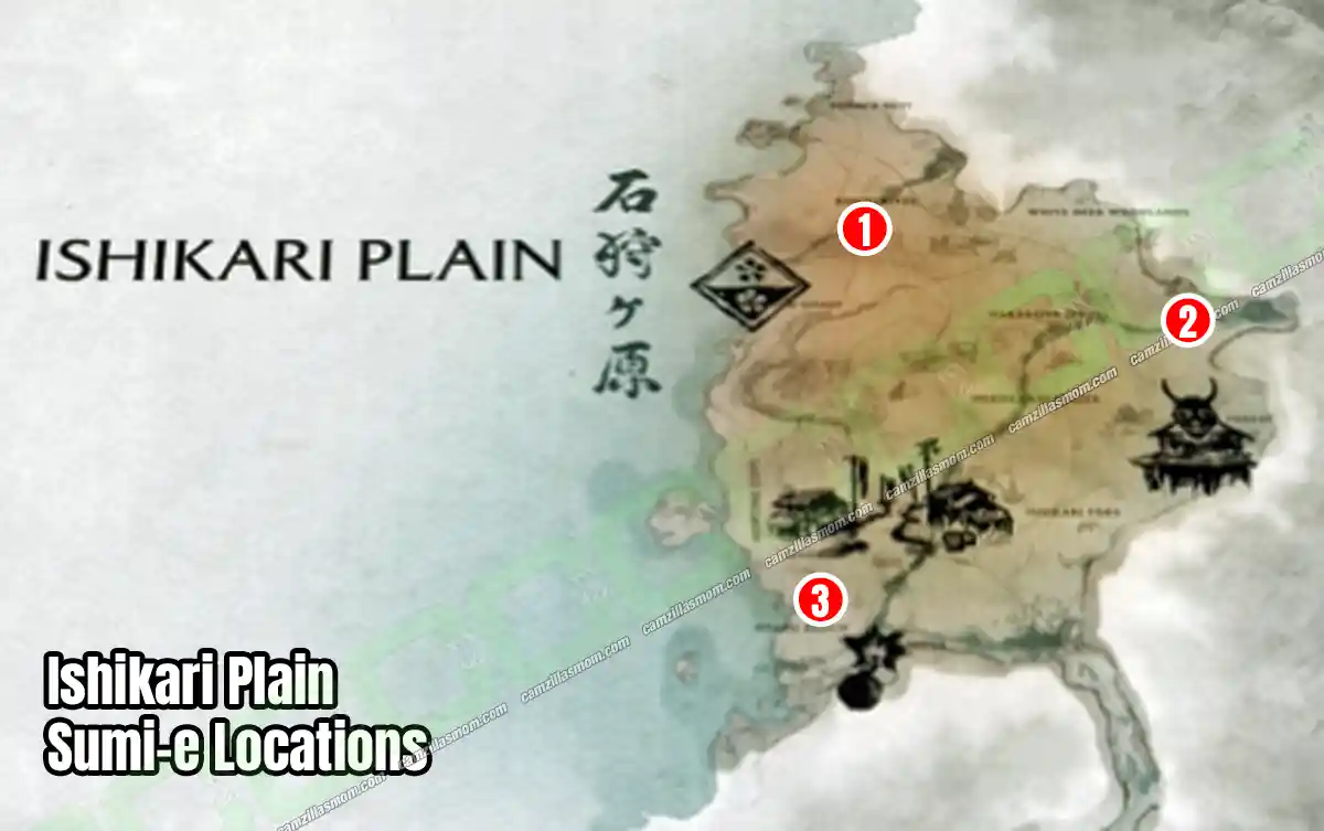 As you can see highlighted in the overview map below, there are three Sumi-e locations in Ishikari Plain. There is a third one that you will draw while following the main story quest.