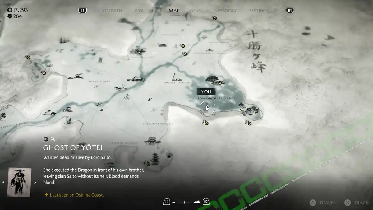 This Sumi-E is down at the Southern Coast of Yotei Grasslands, right by the water. Draw a pincer with your controller pad.