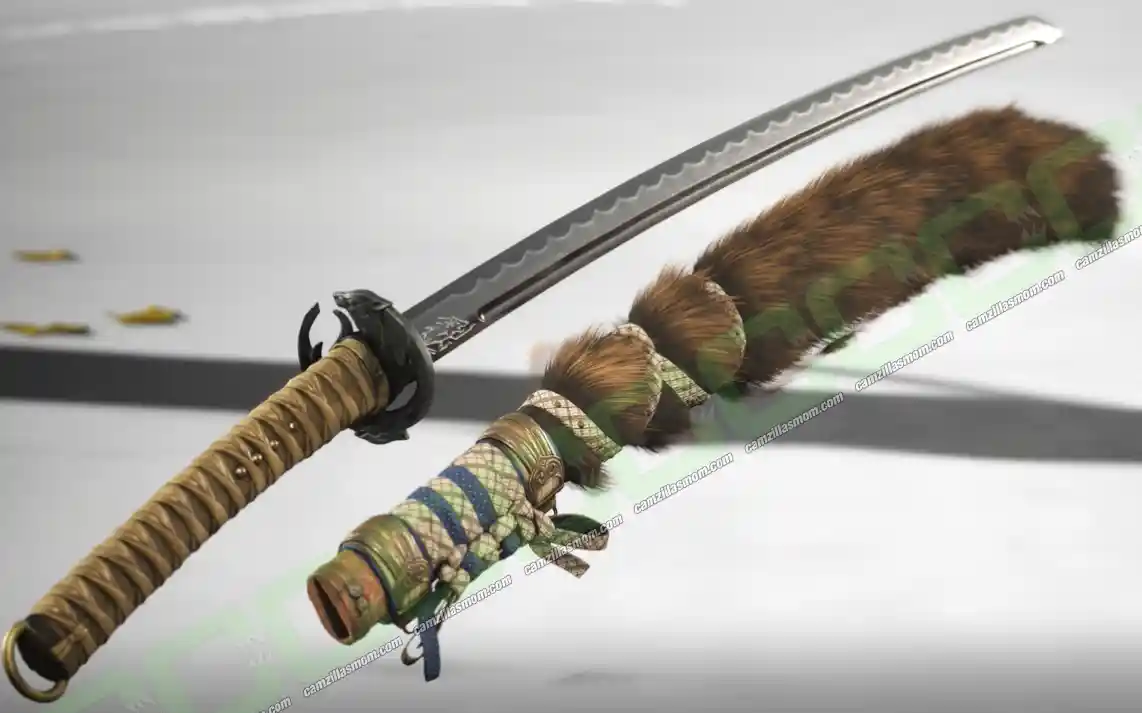 “Jin Sakai’s Sword Kit. Once wielded by a legendary warrior, this blade defended Tsushima and Iki Island from the first and second Mongol invasions. The Shogun then tried to break the blade and its owner. To save his allies, Jin entered self-imposed exile. He was never seen again, but his legend will never be forgotten.”