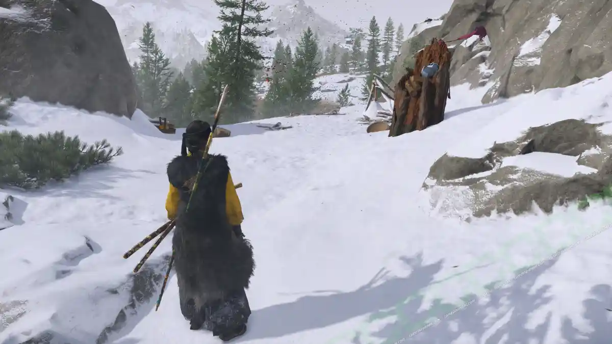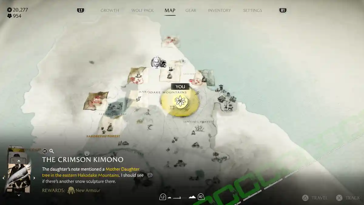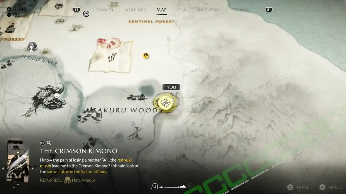 The Yuki Mushi will then guide you uphill to a grave with a stone pile next to it, where the Crimson Kimono is hidden.
