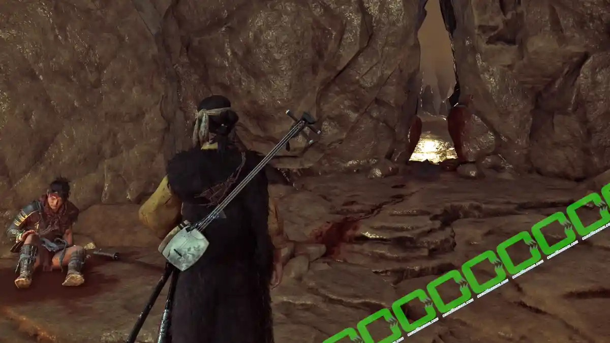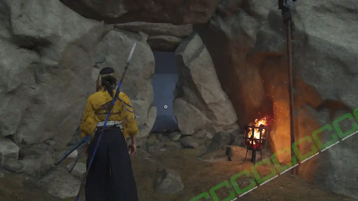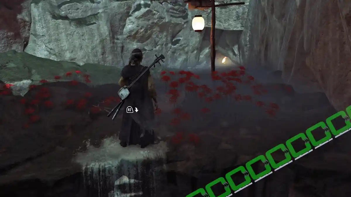 Here are the red spider lilies, leading to a crawl space. Squeeze through there and follow the red flowers into another cave, where you will hear a Saito Outlaw scream in agony. Descend to find a room with a child’s drawings. The cave key is in the note in this room.