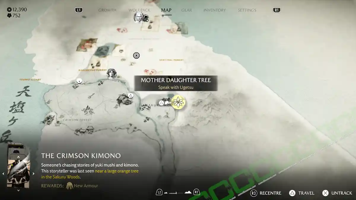 Meet the storyteller at Sakuru Woods in the southeast of the Teshio Ridge region. He’s at the bright orange Mother Daughter Tree. This starts “The Crimson Kimono” quest.