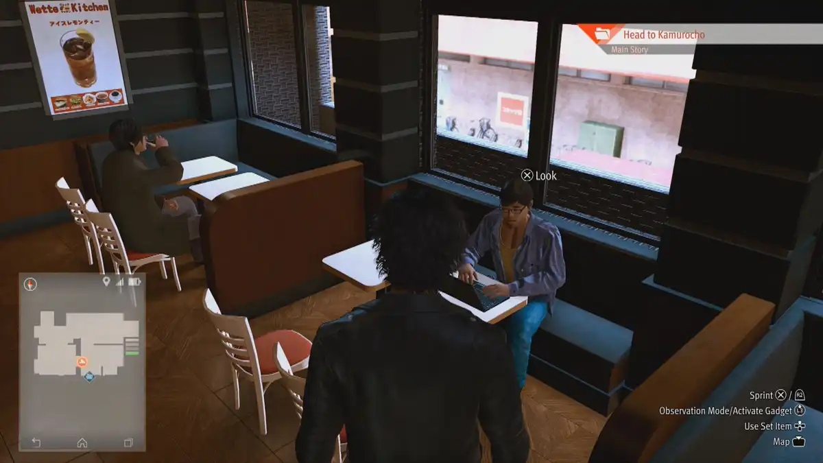 Go to the man in the blue jacket and enter Observation Mode. Examine the Laptop and call the Detective Dog through the Dog App. Follow the Dog to the target, then call the client. Fight Kinugawa to close the case.