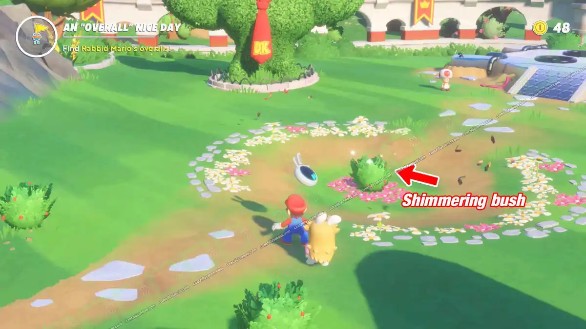 So, you’ve just started Mario + Rabbids – Sparks of Hope and arrived at Peach’s Castle, where you find Rabbid Mario hiding in a bush. In the first mission, “An ‘Overall’ Nice Day”, he misplaced his overalls, and it’s your job to find them in one of the bushes in the area. It’s your first day at work as Hero Mario, so you may need a little help starting up. Here’s what you need to do.