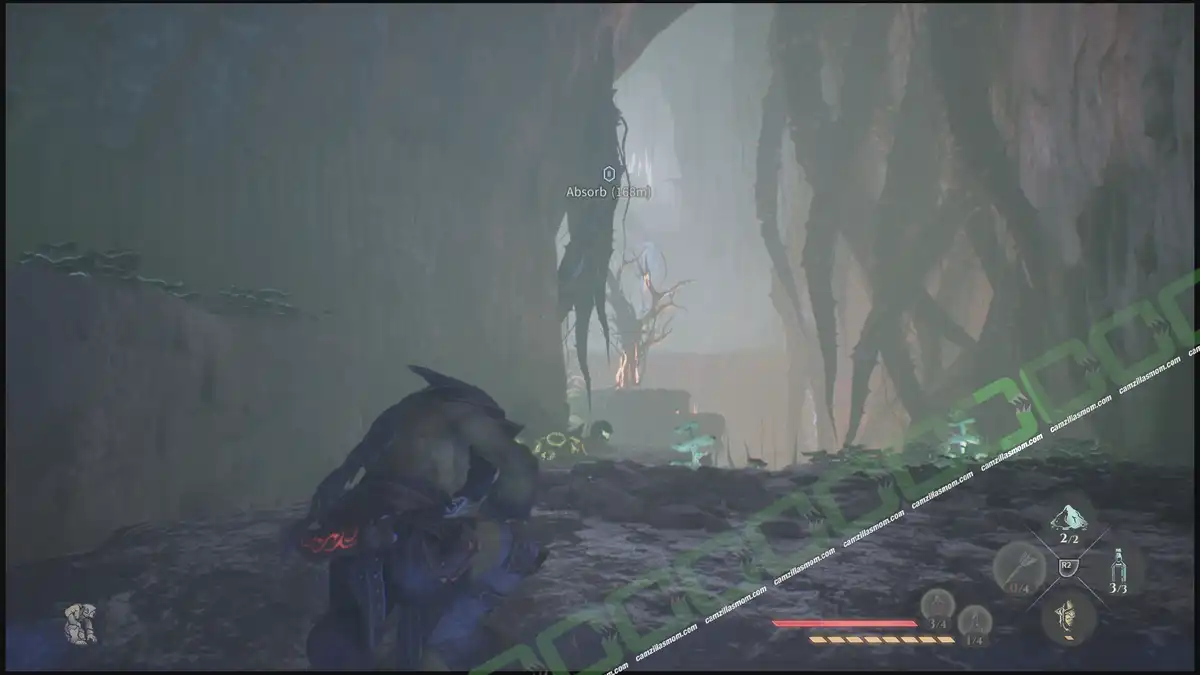 After the absorption, the deadly bug swarms arrive. Keep in mind that you are safe from them in the bright-green, big-leafed mushrooms. Now you need to grapple your way out. Glide all the way down to the island with the glowing mushrooms, where Styx gets the idea to follow them.