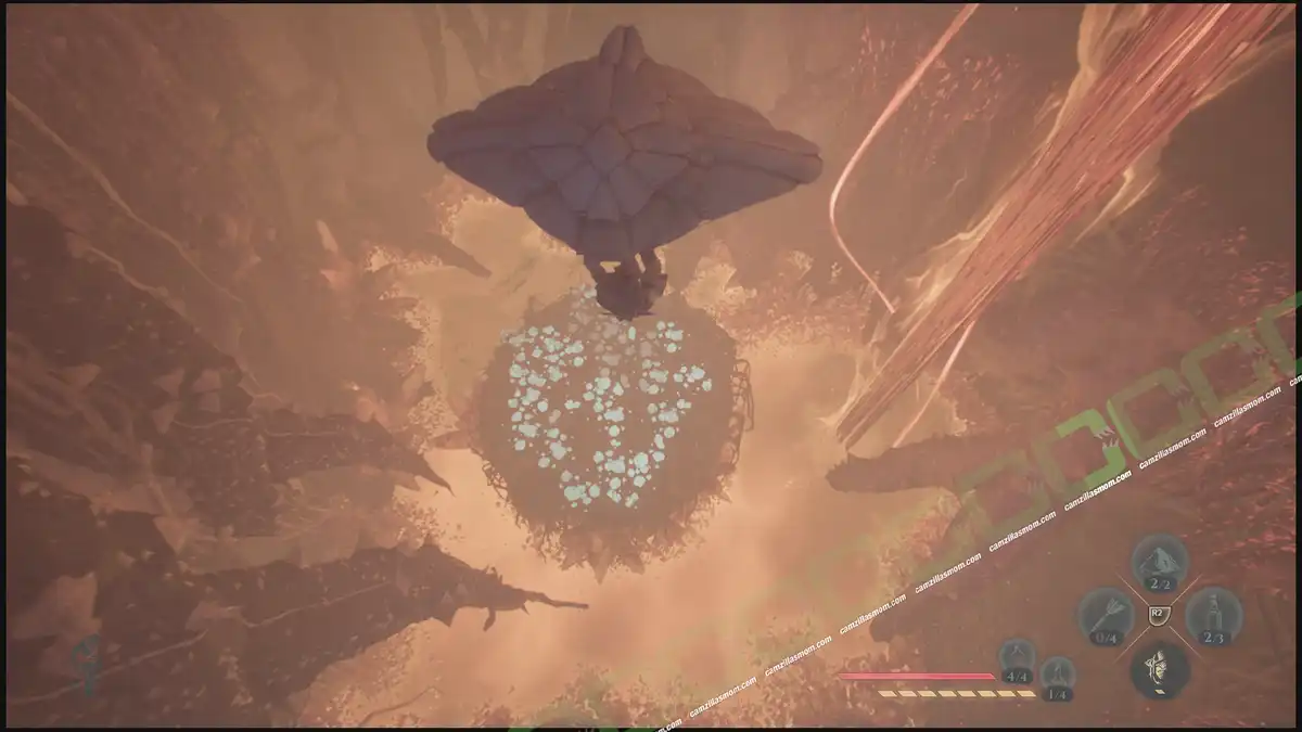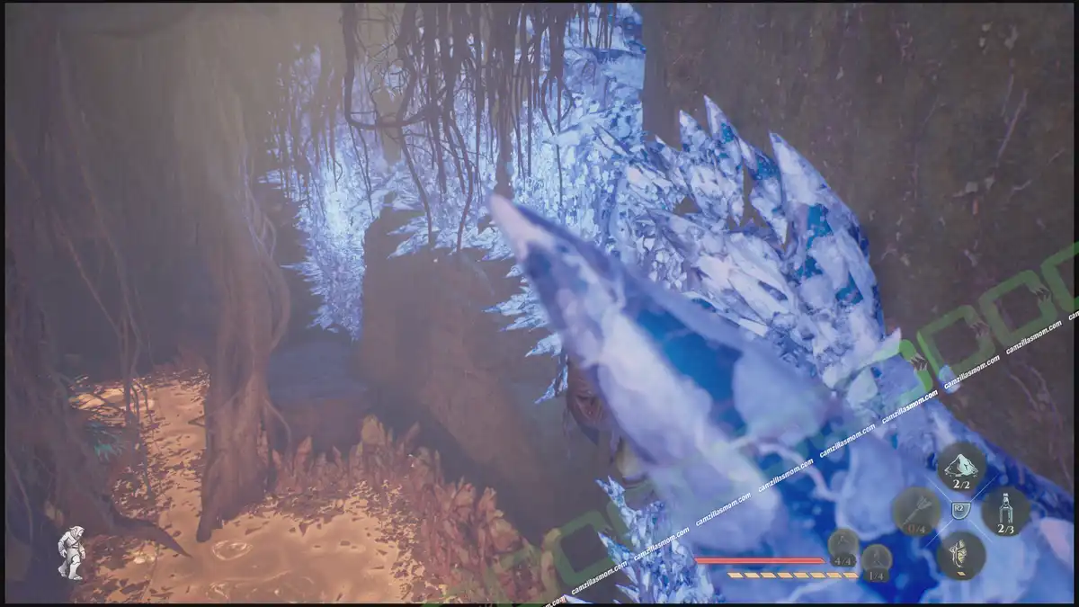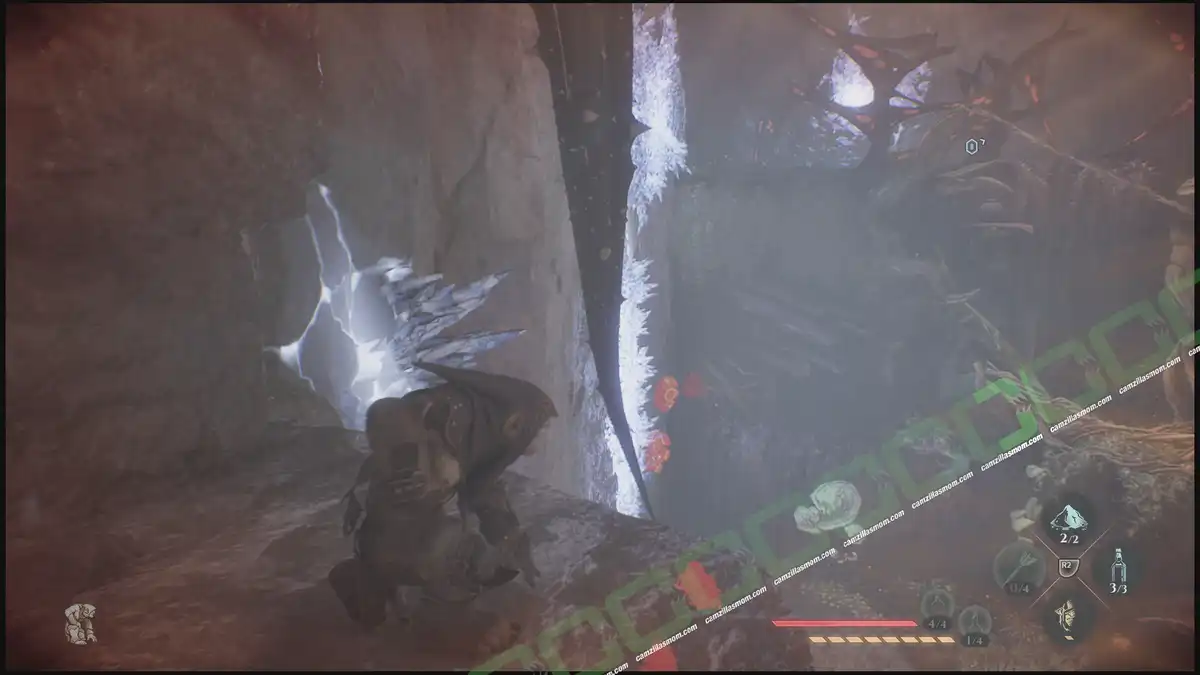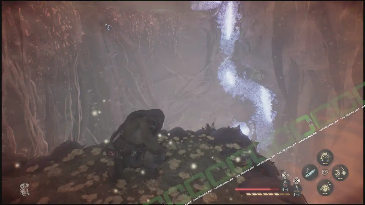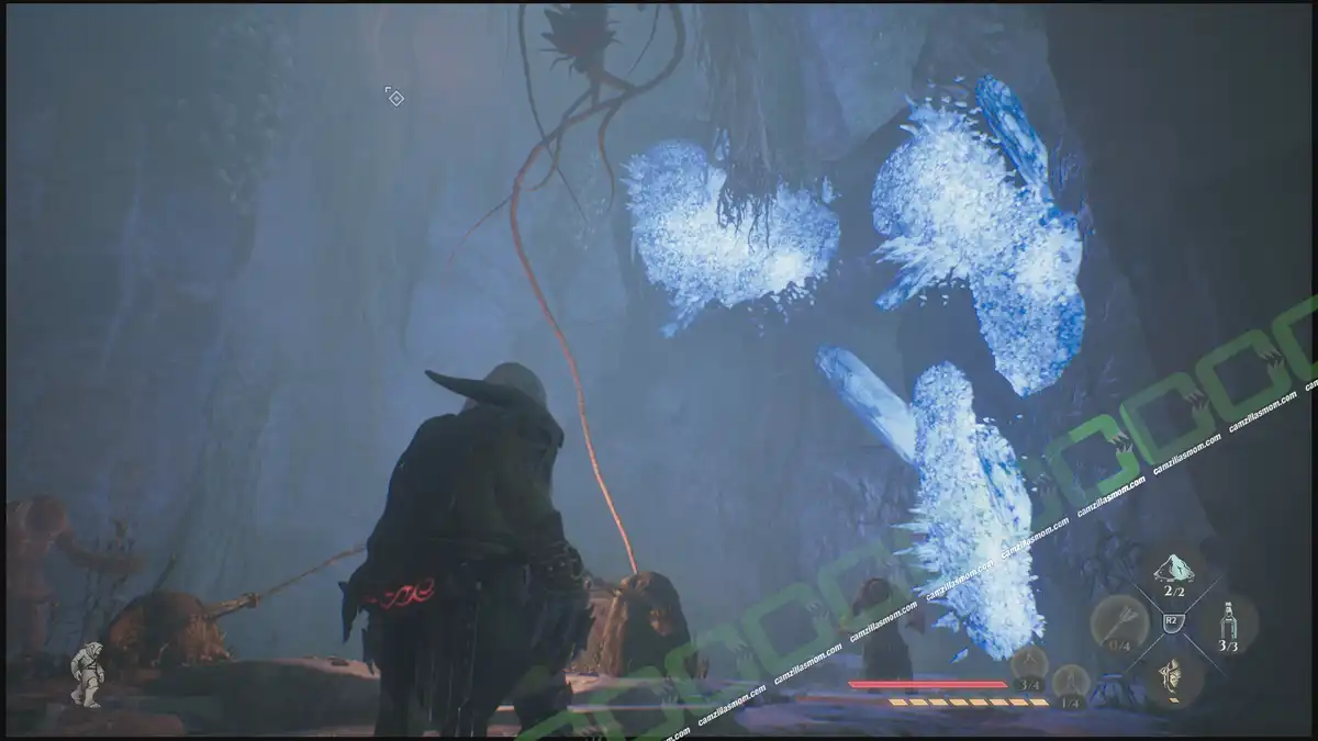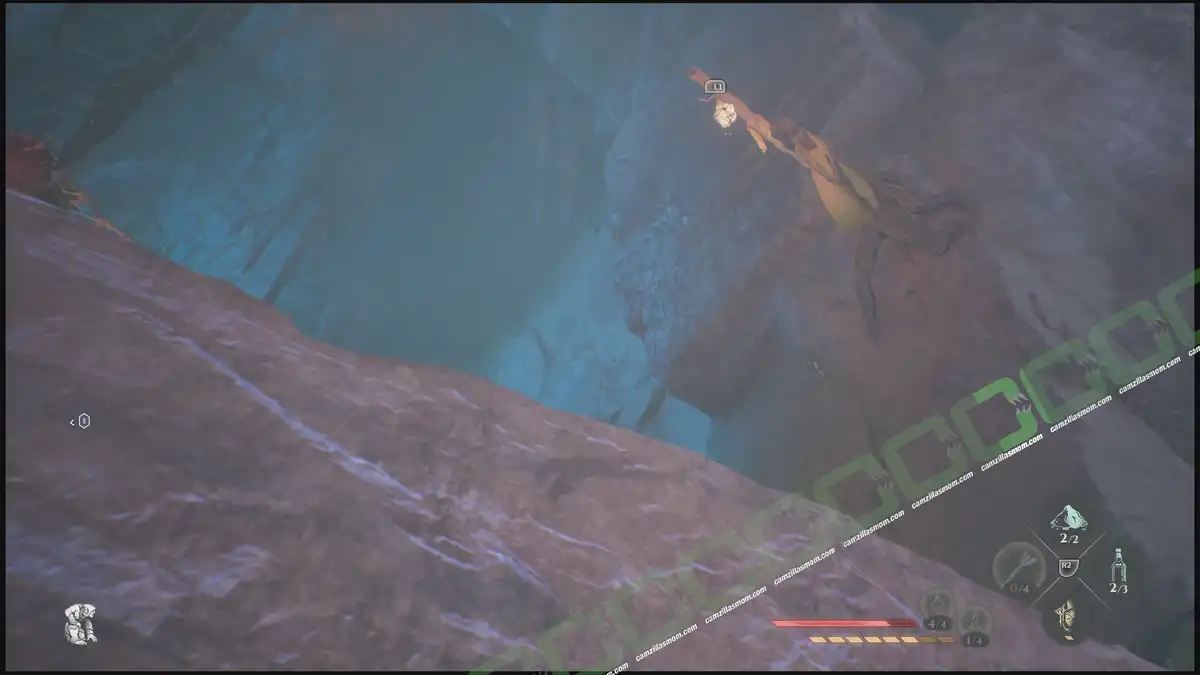 I crossed her nest in a rush and used the glider to reach a long crystal wall going up on the other side of the cave. At the top is another bug mother and some mushrooms. The target is the next crystal wall ahead. Near the wall, I threw a bottle to distract the bugs so I won’t interfere with the mushroom. Then I started my climb. There is a grapple at the top, that takes you to the next bug’n’mushroom area (sounds like a twisted meal). There is another crystal wall at the end. This last wall will lead to the Quartz stone and it can be absorbed.