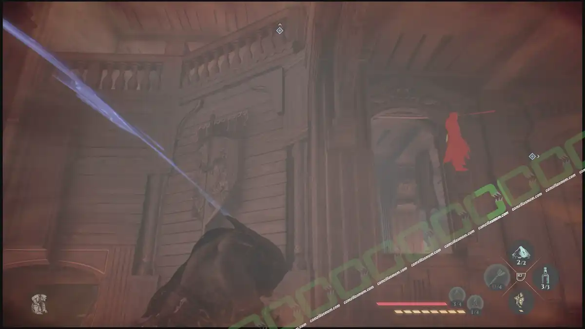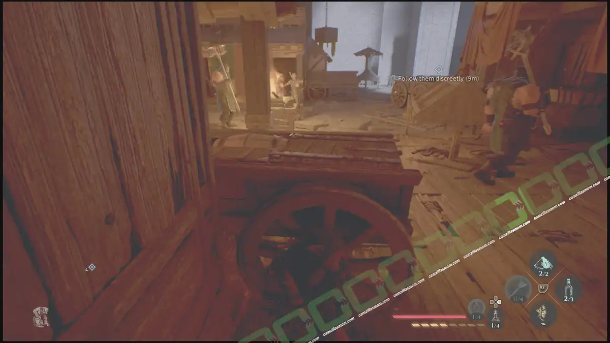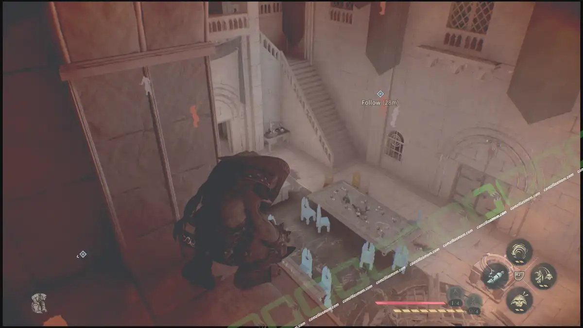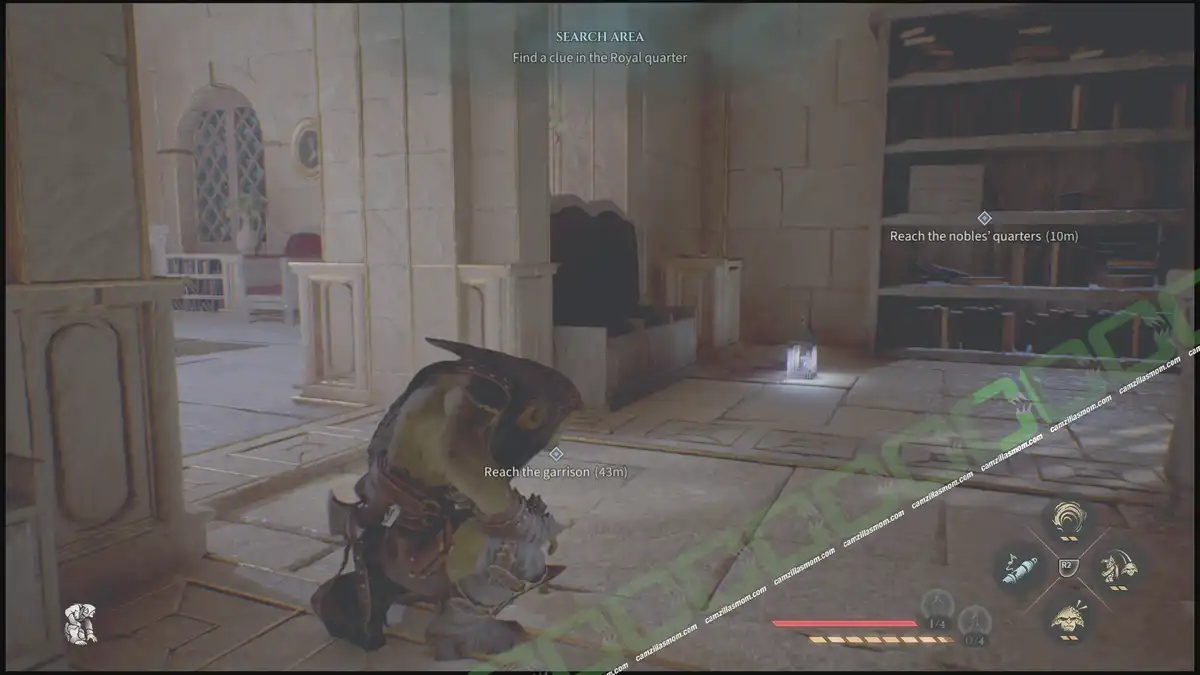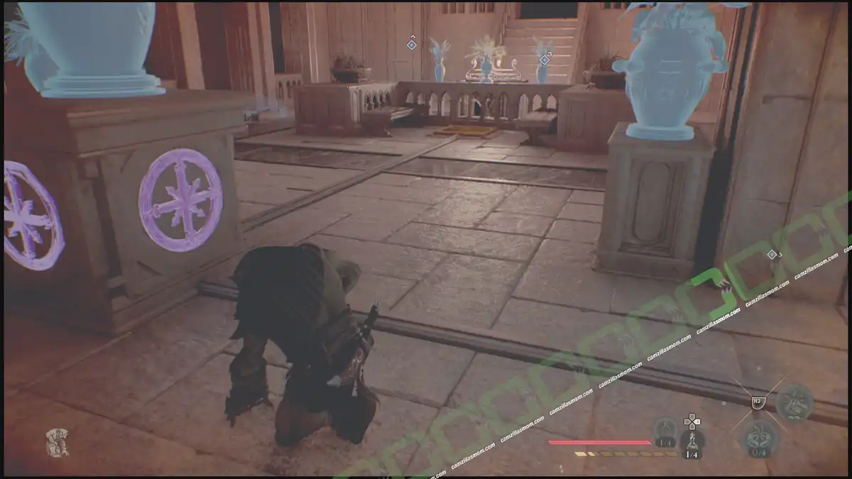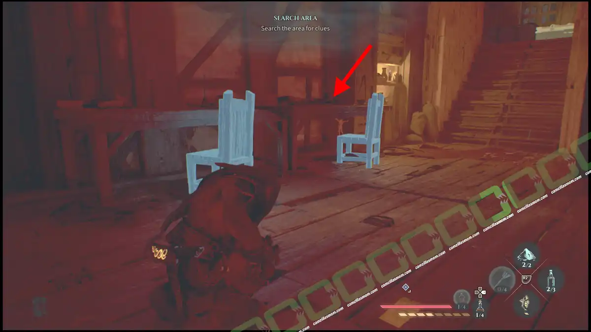 You will learn that there is a vase that opens a secret stash stored in the library. But it had gone missing, with spilled wine all over the floor. The guard suspects the kitchen staff being involved. Follow the guard discretely to the kitchen. He’s leaving footprints in Amber vision.