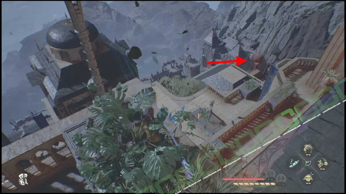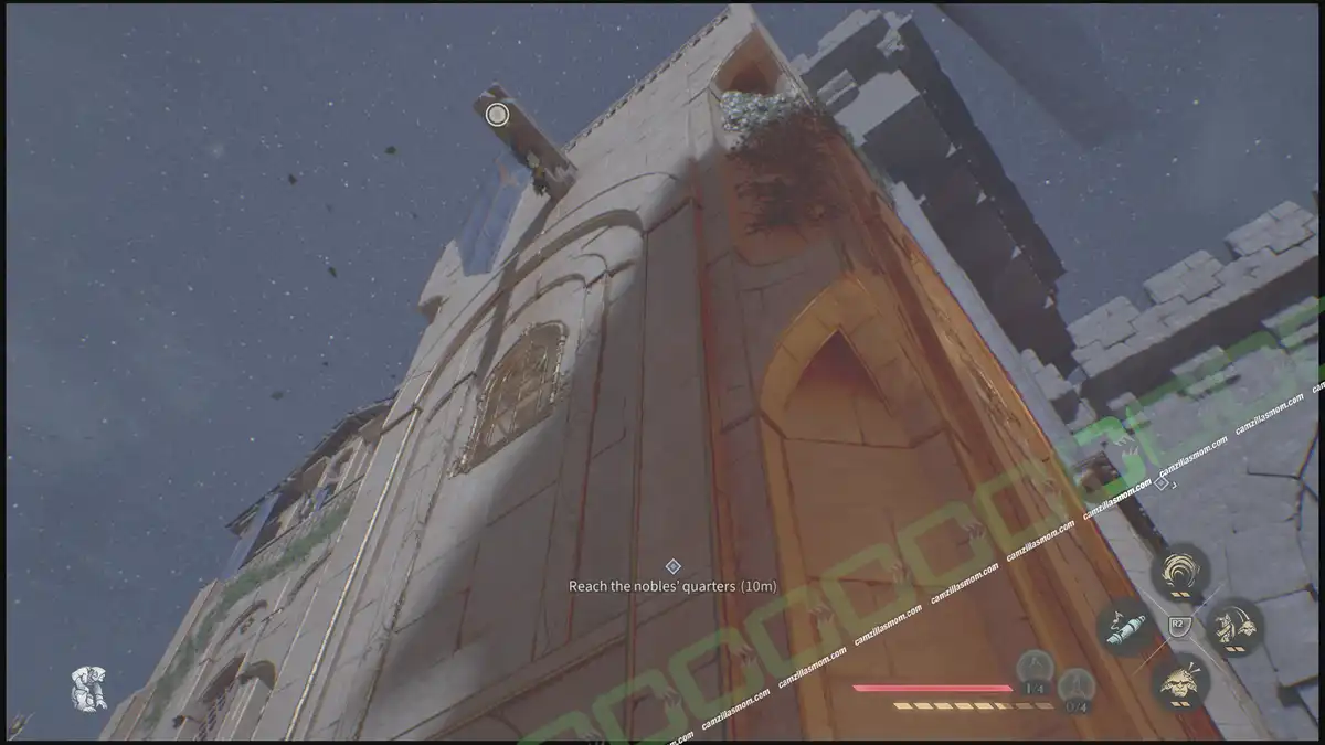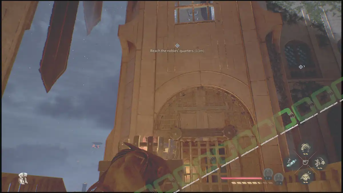 Keep climbing the crystal wall until you reach the top. Here you can reach an overhead grapple point to reach an area just above the Nobles’ Quarters artifact. You can glide down to a tower-like building with a metal gate. The artifact is inside.