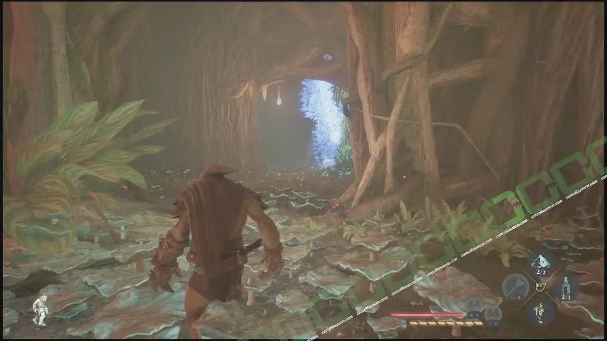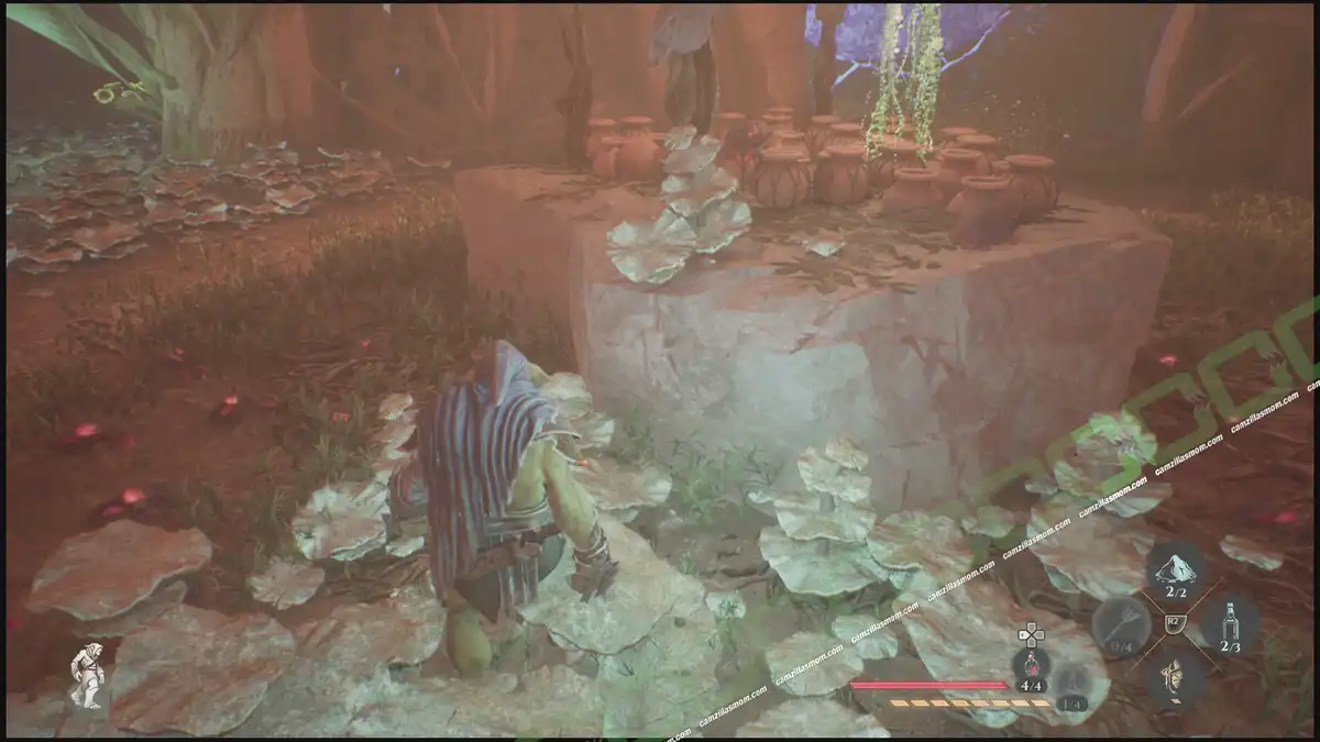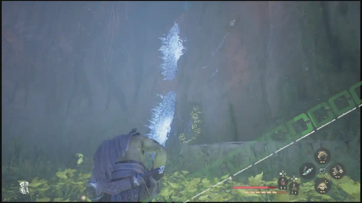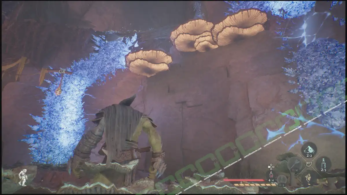 From the island, use the grapple to reach the next green mushroom patch. Jump across to the crystal wall and climb it to the other end.
