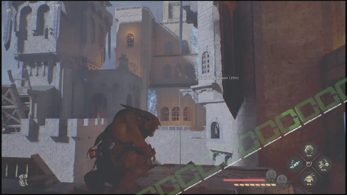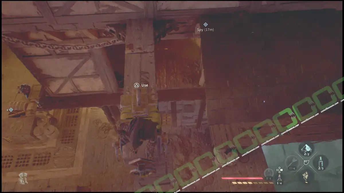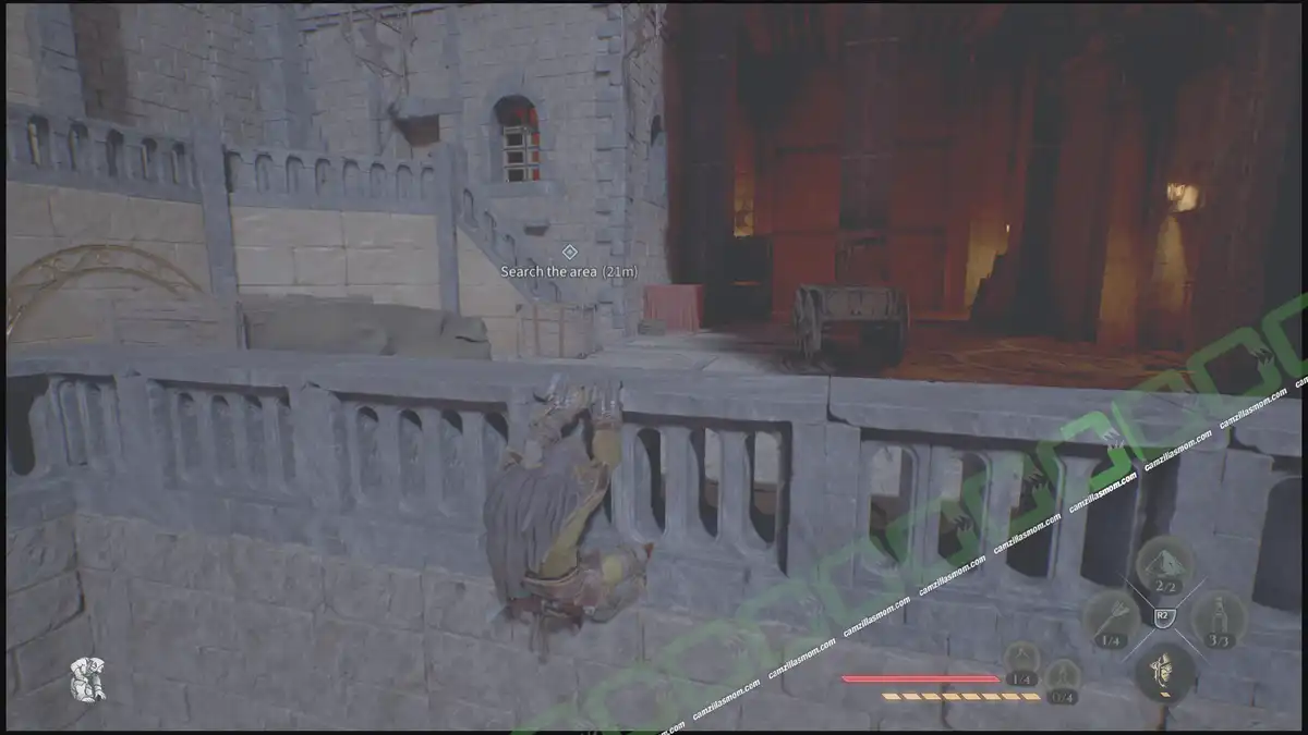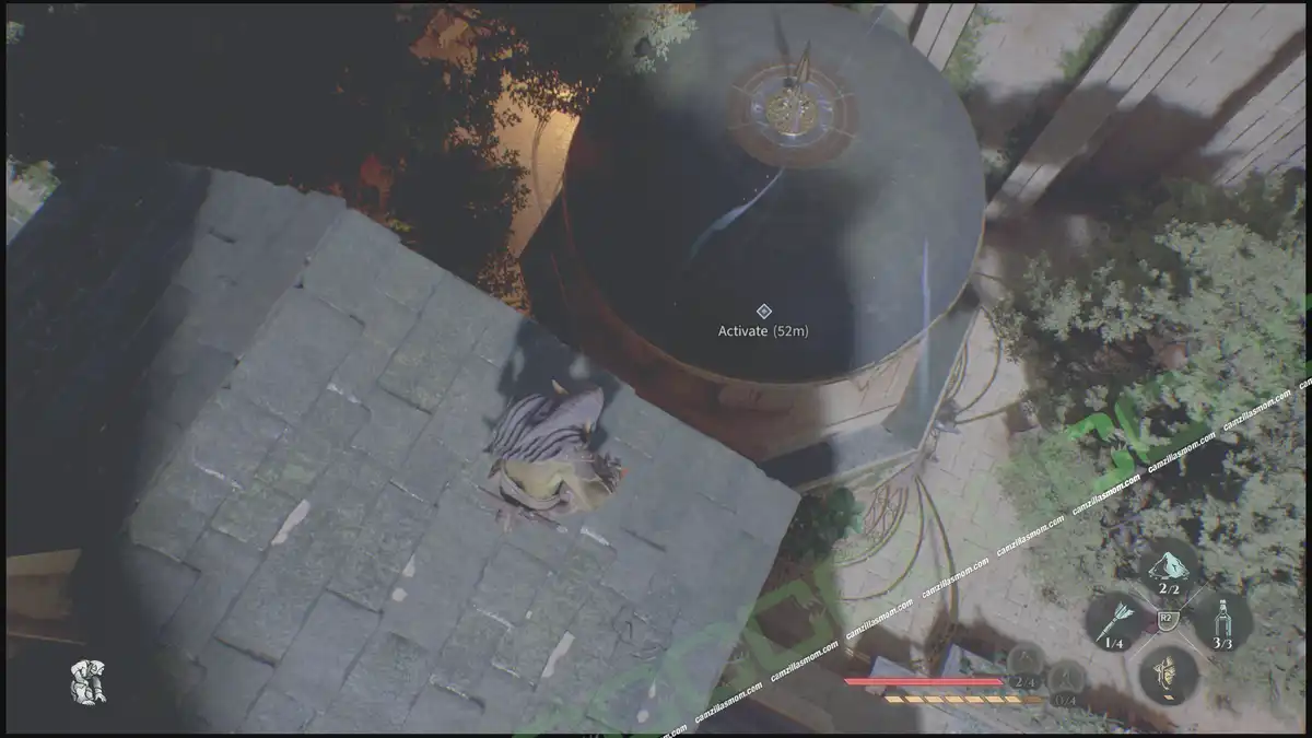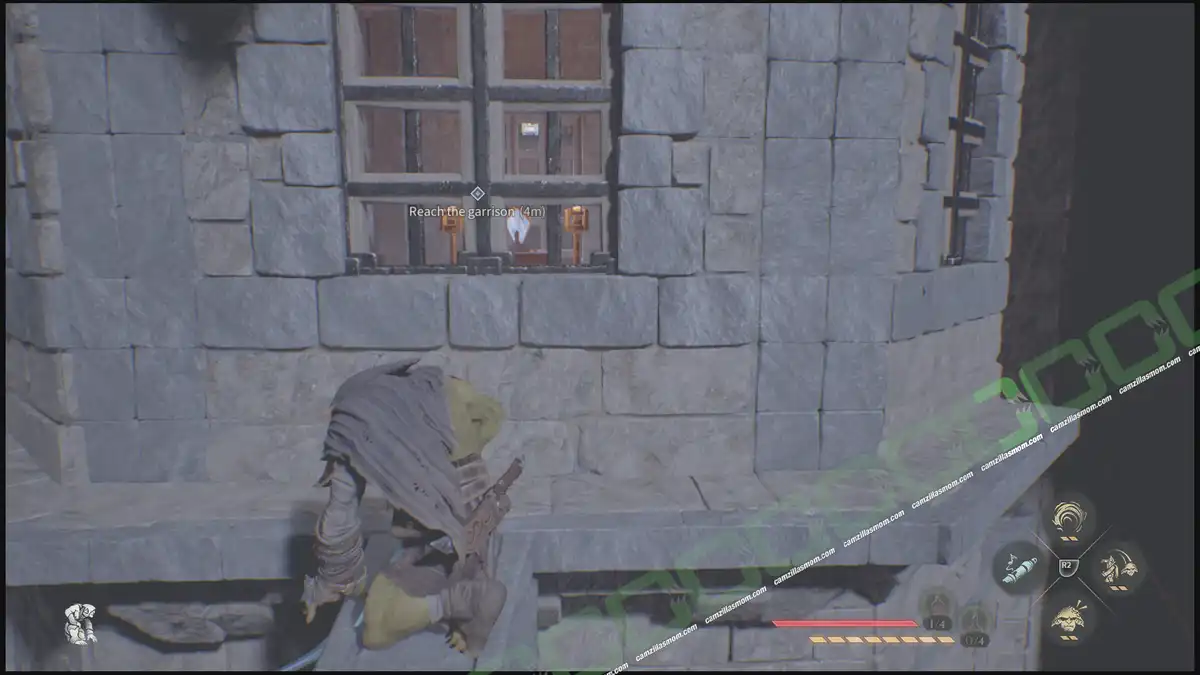 Then, I took the balloon to the garrison, where I could easily reach the building with the artifact. Drop down on the rope but be careful: There is a guard just below who will see you.