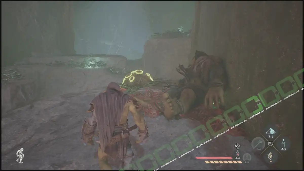 You now have to approach the Quartz Stone. It leads through a bug-infested area. Here is a single bug next to a mushroom. If you get over there, you will find an Emerald Thief Emblem next to a dead orc.