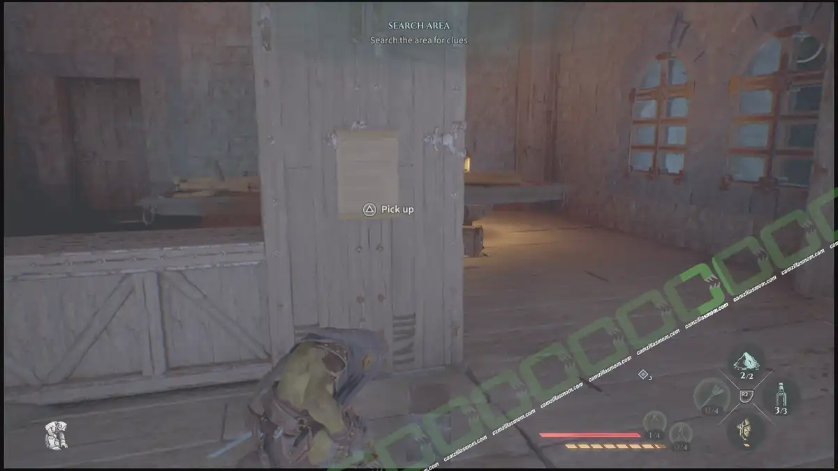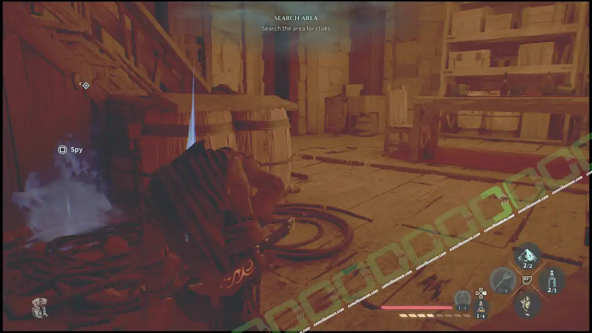 On one of the tables in here is a letter – it looks like a blueprint – on the table. I picked it up already, but I marked the location on the screenshot below. Go downstairs and “Spy” in the corner of the room.