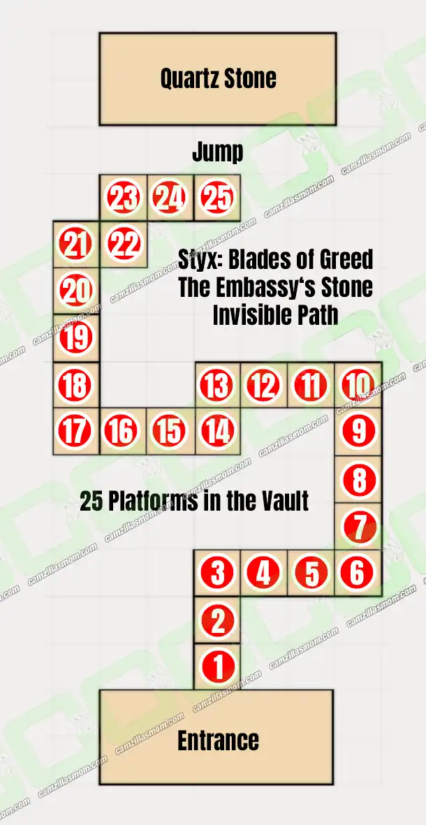 I created the graphic below to show a birds eye view of the platforms and where they are. Once you stand on the 25th platform you can jump across to absorb the Quartz Stone. Exit the vault after collecting the stone.