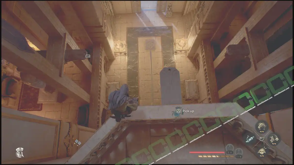 Head down to the building’s ground floor entrance, where you can use another rope on a platform to climb one floor up. From here, you can reach the room with the artifact through the staircase.