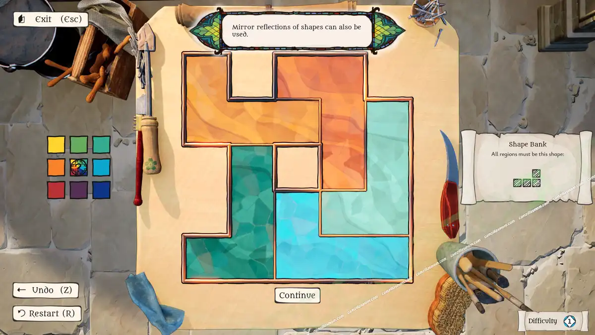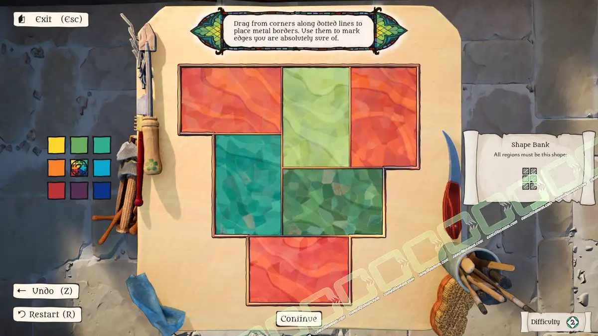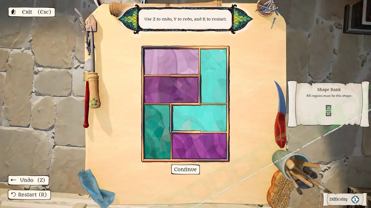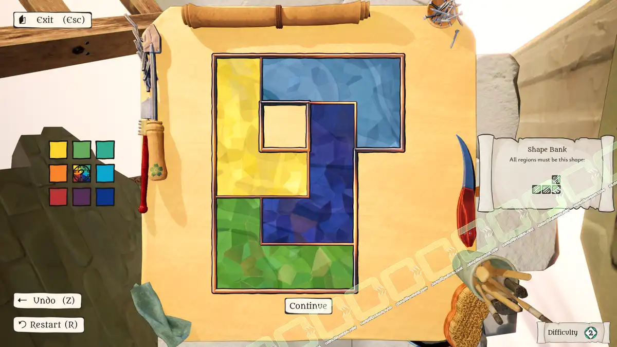 The Artisan of Glimmith is a puzzle game in which players fill a preset grid of empty tiles with predefined shapes, following specific rules. The goal is to restore an ornate window in a specific area to its full golden glory and solve all puzzles in that area.