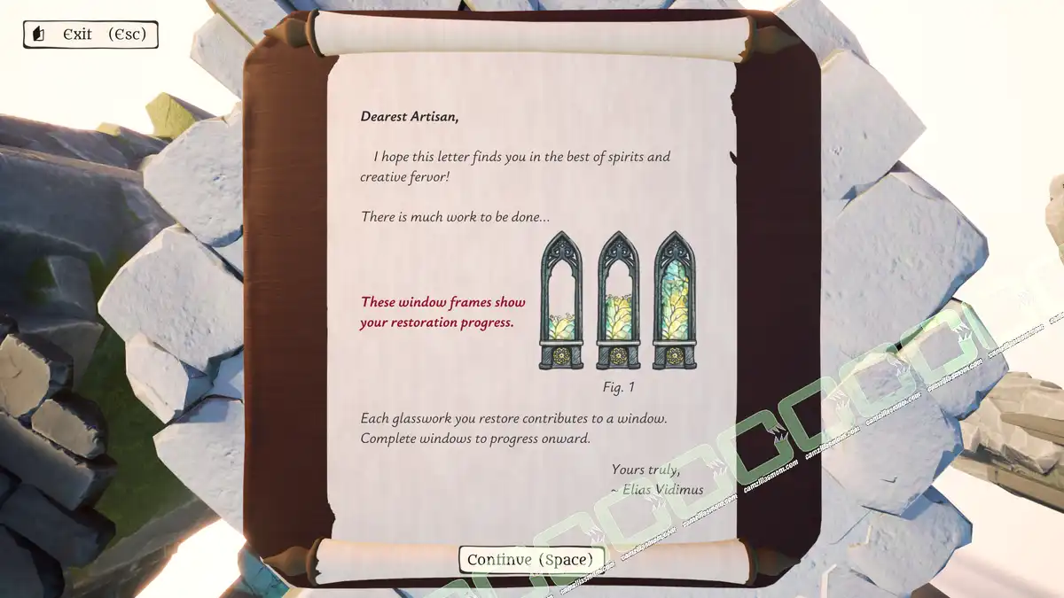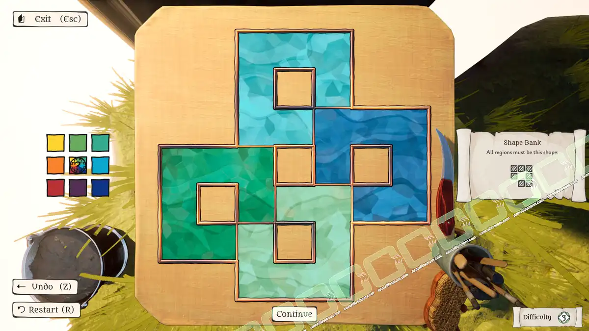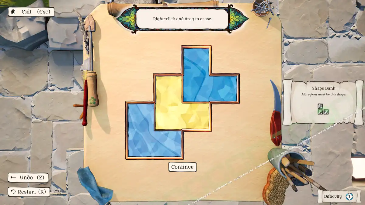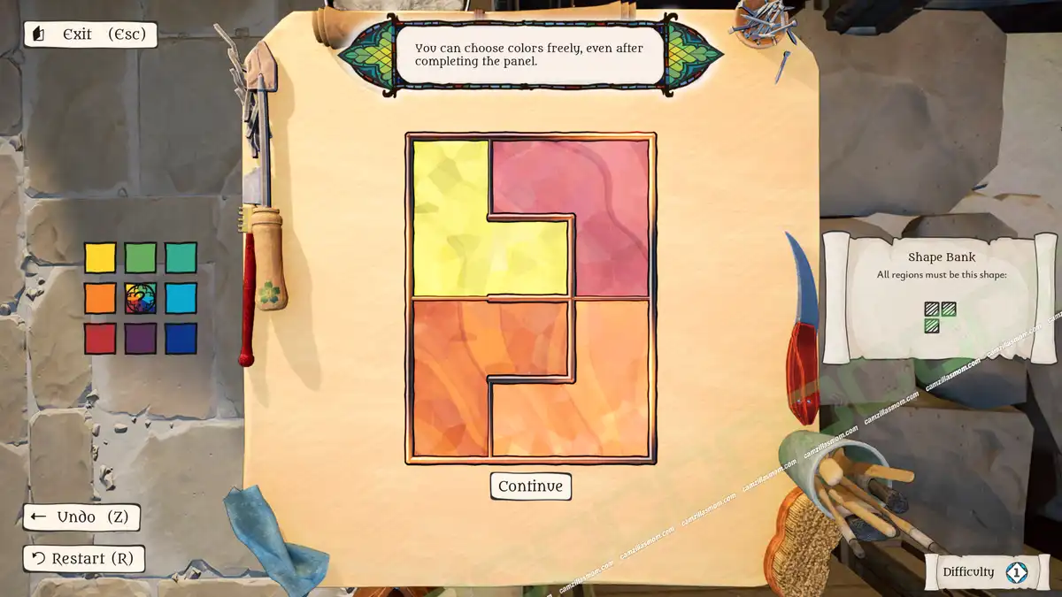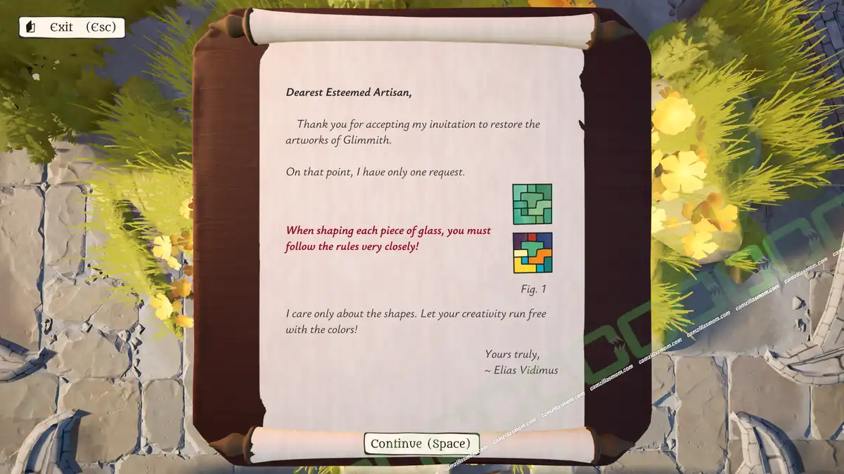The Artisan of Glimmith is a puzzle game in which players fill a preset grid of empty tiles with predefined shapes, following specific rules. The goal is to restore an ornate window in a specific area to its full golden glory and solve all puzzles in that area.