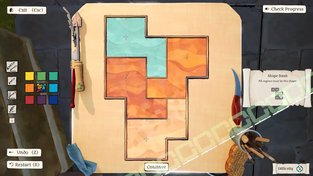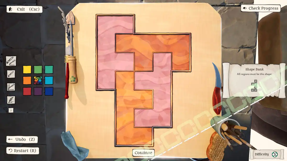 The Artisan of Glimmith is a puzzle game in which players fill a preset grid of empty tiles with predefined shapes, following specific rules. The goal is to restore an ornate window in a specific area to its full golden glory and solve all puzzles in that area.