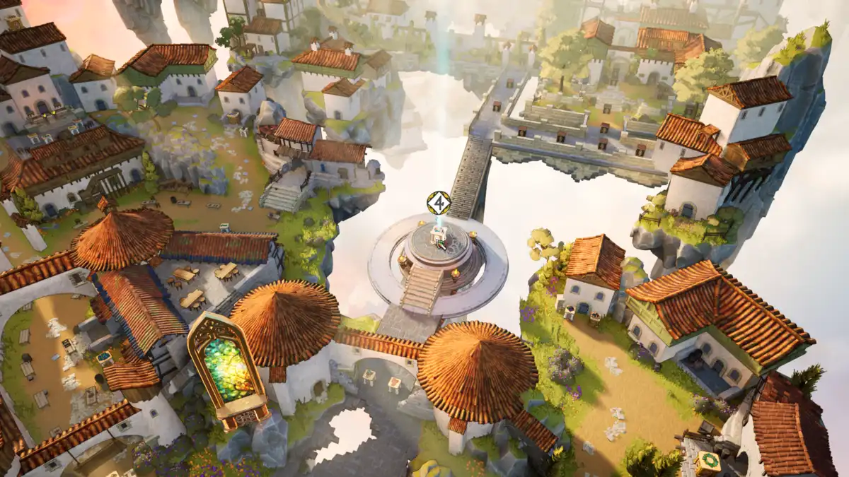 The fifth window is in a village area, in a large courtyard with tables and chairs spread out. This Window requires 8 Puzzles to restore, 14 to turn it silver, and 23 to turn it golden.