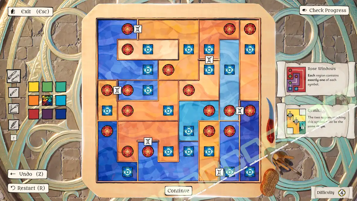The game is divided into areas with a window that needs to be restored, and players must solve a minimum number of puzzles in each area to do so. Solve all puzzles to fully restore the window to gold status.