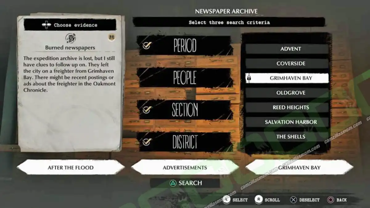 Collect all the Evidence at the Expedition Headquarters. Then, head over to The Oakmont Chronicle (Newspaper Symbol on the map).