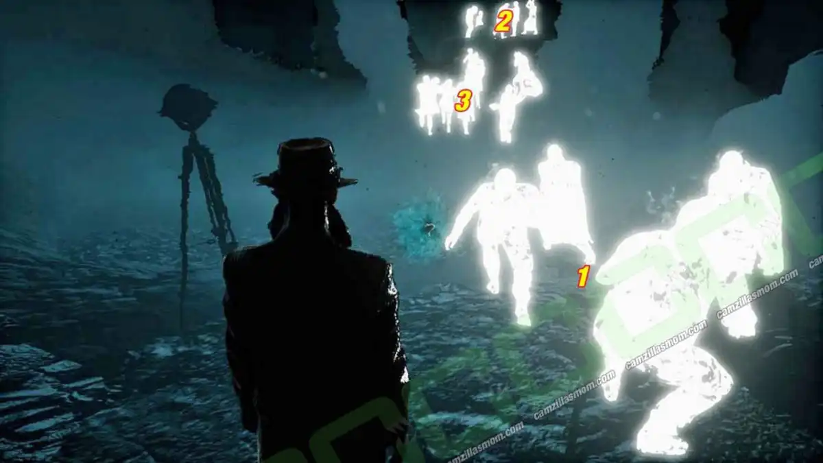 There are 3 glowing blobs in the area. Go to them to reveal their story. Then number them in the following order: