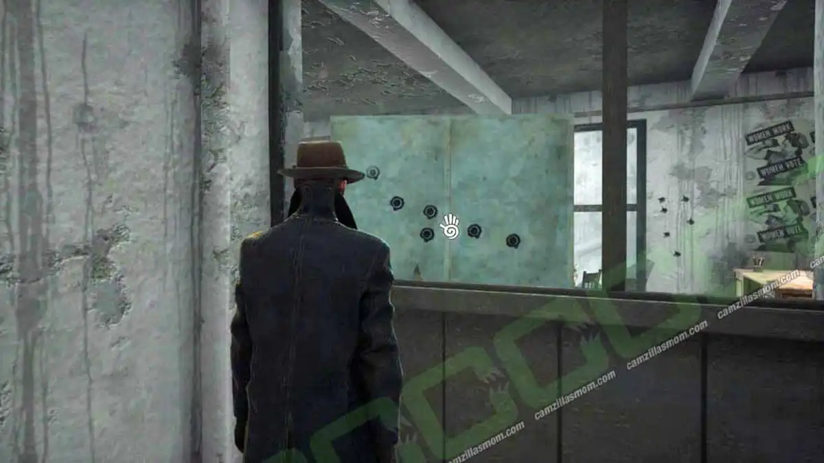 After you entered, investigate the dead body on the floor. Go downstairs and talk to the survivor. Then use Mind’s Eye on the sign behind him to reveal the passage.